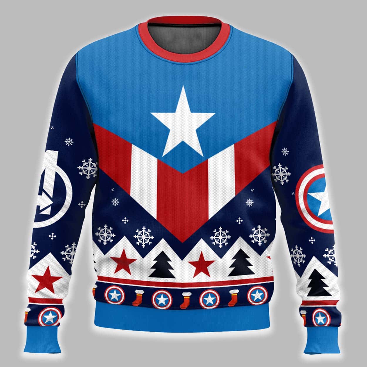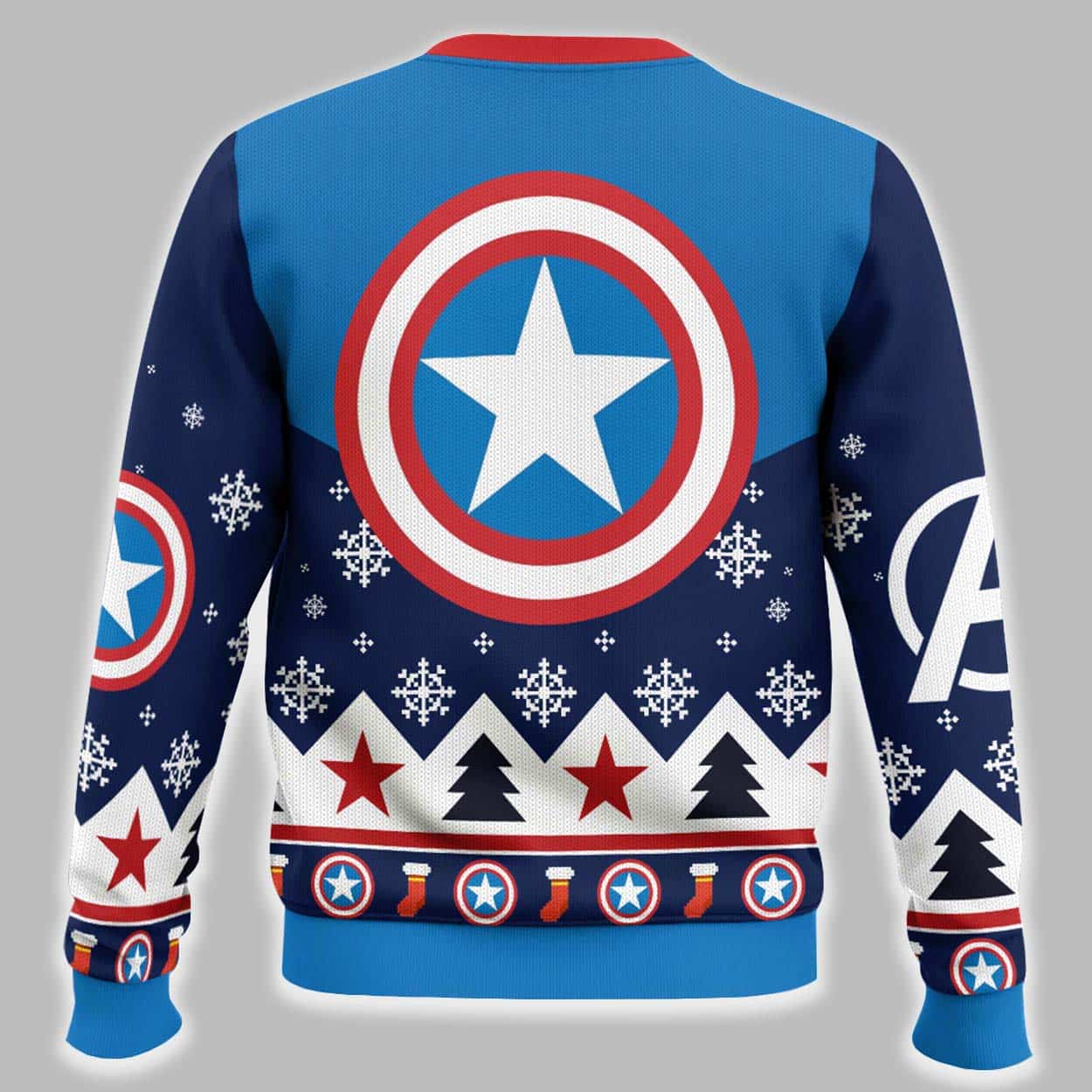 Salute the holidays like the First Avenger with this incredible Captain America Retro Ugly Christmas Sweater. This pullover perfectly captures the “ugly sweater” style while showcasing iconic superhero design. The festive blue sweater features Captain America’s signature red and white striped chevron pattern with a central star on the chest. The back proudly displays his full shield logo. The design is woven together with classic holiday elements like snowflakes, Christmas trees, stockings, and even subtle Avengers logos.