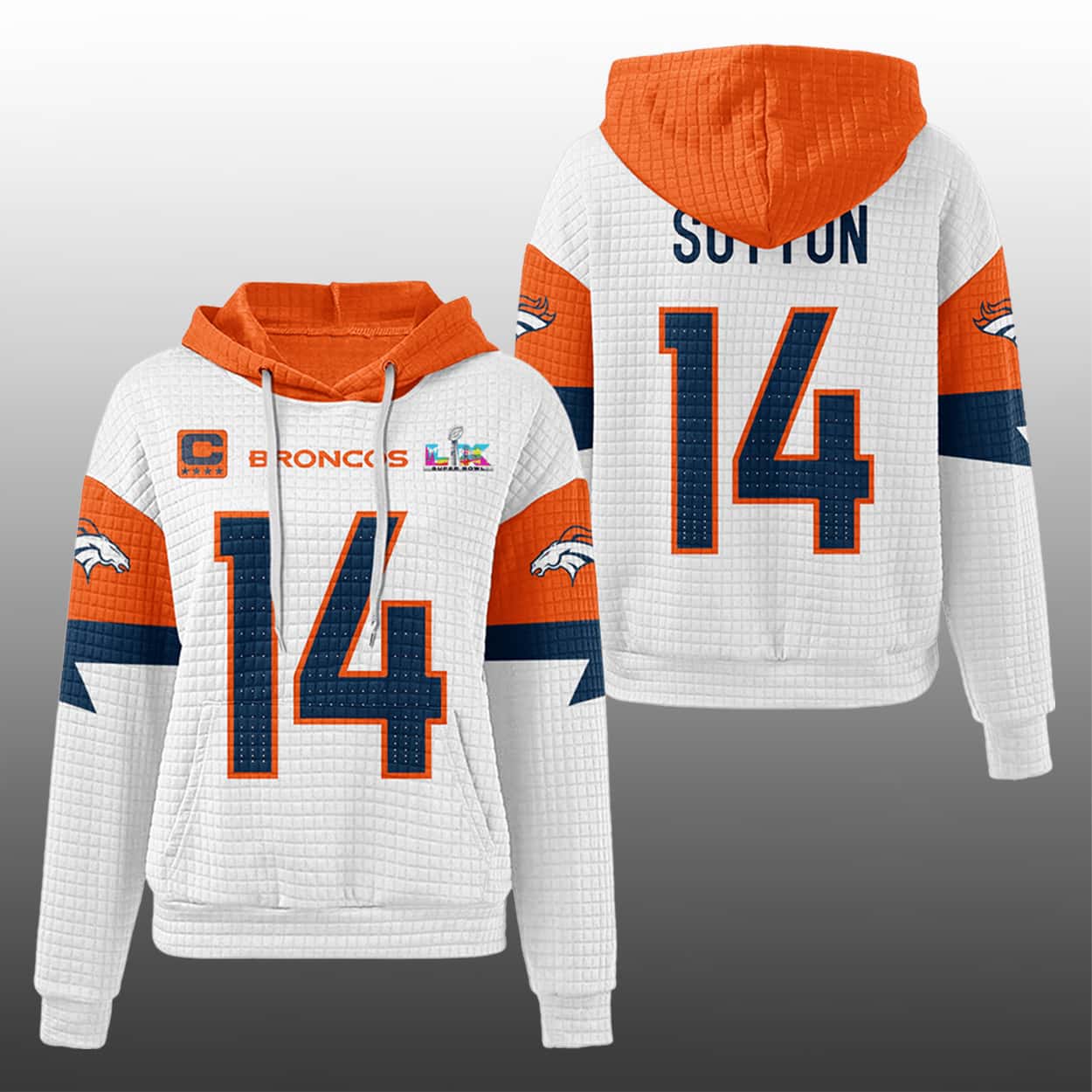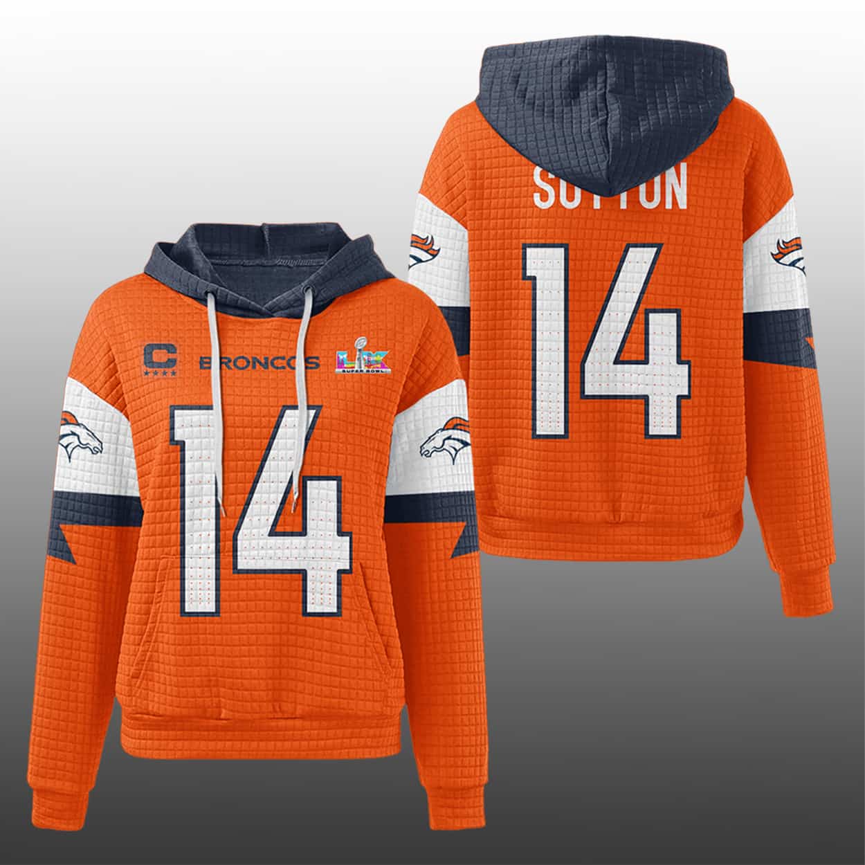 This hoodie is a fiery tribute to Denver’s star wide receiver and their SB LX glory. The front rocks the “BRONCOS” name in crisp white, flanked by the team’s iconic logo, a SB LX badge, and a captain’s “C” that signals leadership. The number “14” blazes across both front and back, while “SUTTON” sits proudly above it—because legends deserve spotlight. The sleeves bring the heat with white panels, navy stripes, and Broncos logos that make every arm movement a celebration. The navy hood and white drawstrings add contrast, giving this hoodie a game-day-meets-runway vibe.