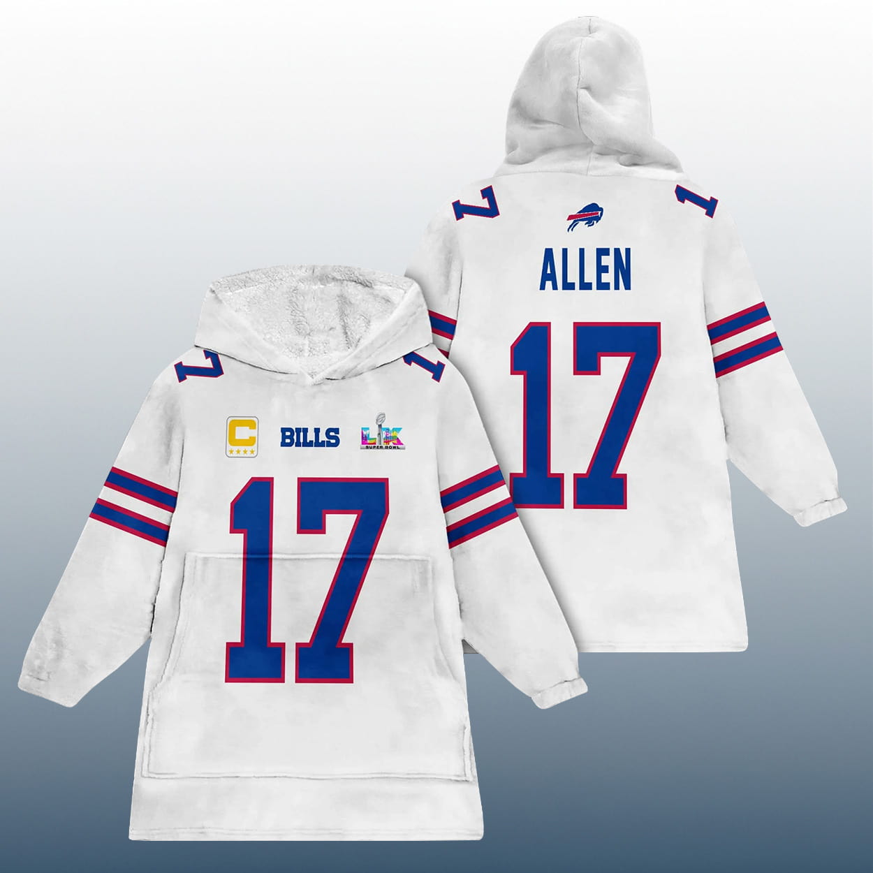 Command attention and cozy vibes with this hoodie. Styled like a football jersey but built for laid-back lounging, this hoodie features the iconic number “17” front and back, honoring Bills quarterback Josh Allen. The front rocks the Bills logo, a captain’s patch with a bold “C” and four stars, and a SB LX emblem that hints at championship dreams. Red and white sleeve stripes add a sporty punch, while the back proudly displays “ALLEN” above the number—because legends deserve the spotlight.