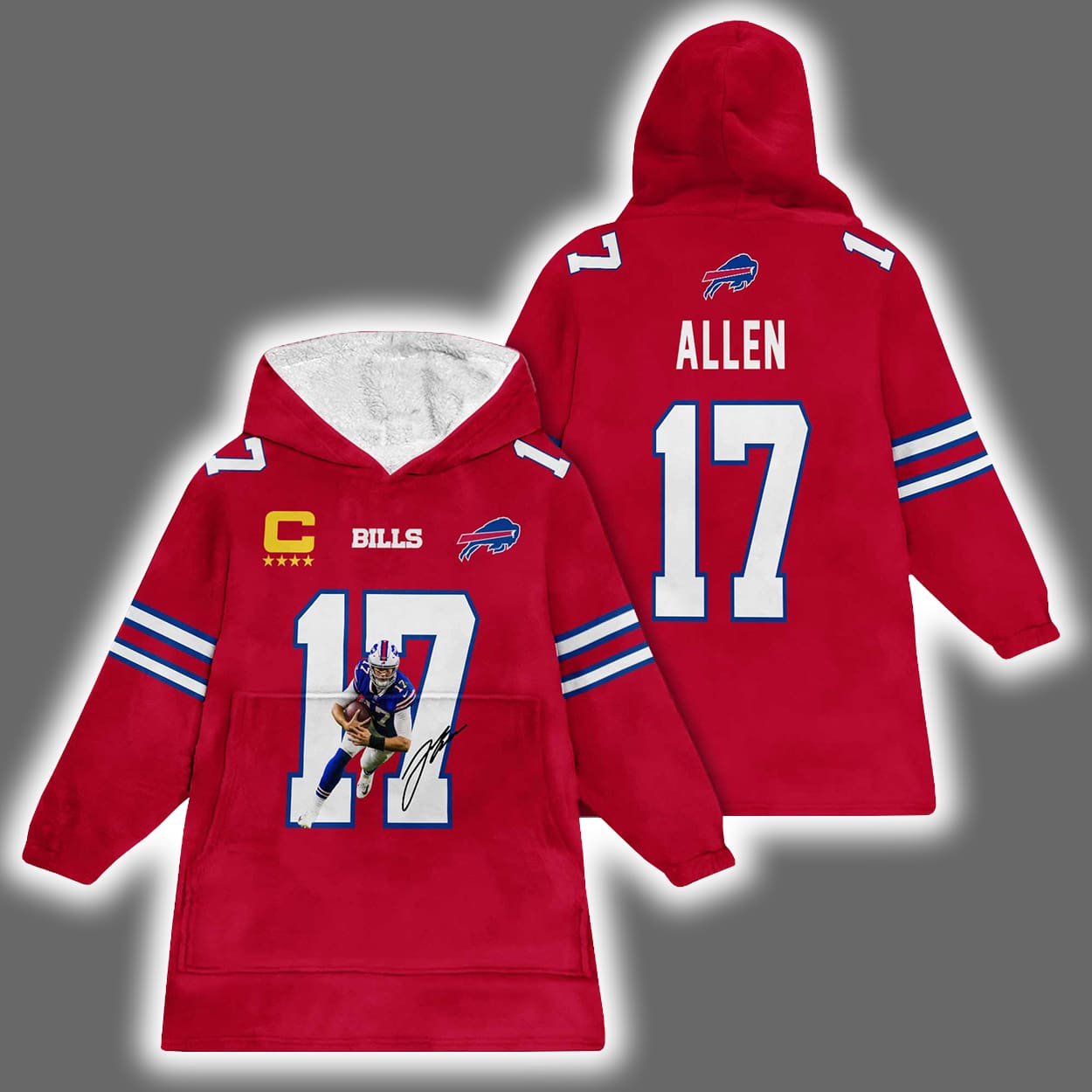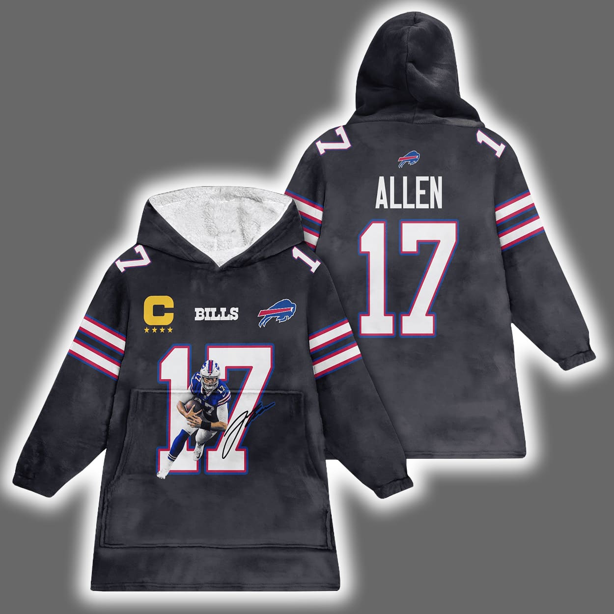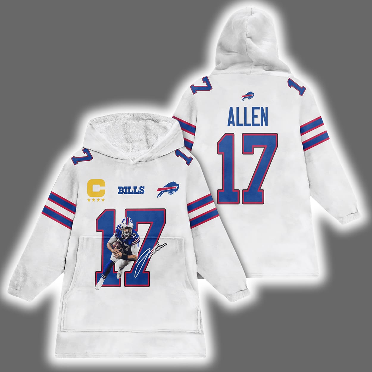 Step into the zone of ultimate comfort and team spirit with this hoodie. This hoodie is a fan’s dream come true, featuring a dynamic front image of a football player in action — arm cocked, eyes locked, ready to launch a game-changing pass. The number 17 and the name “ALLEN” are printed loud and proud on both the front and back, while the Bills logo and a captain’s patch with four stars add a layer of leadership flair. Blue and white stripes race down the sleeves, giving it that extra jolt of sporty swagger.