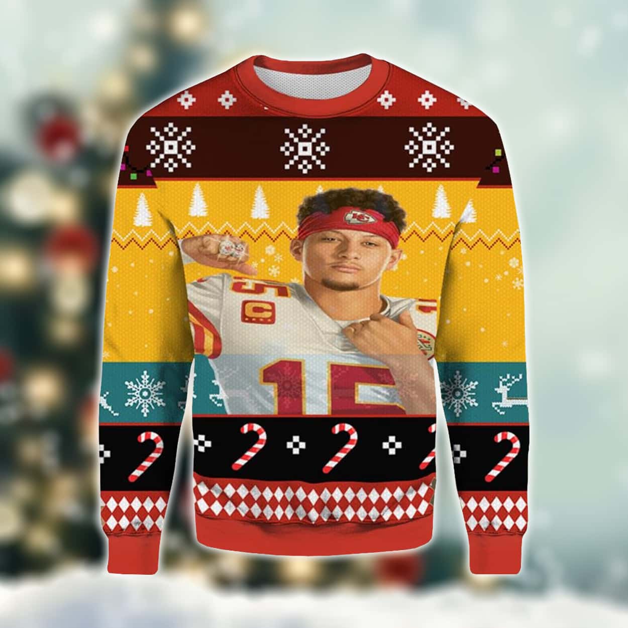 Step into the holiday spotlight with this sweater—a dazzling tribute to Kansas City’s gridiron hero. Front and center is a vibrant image of Mahomes in his signature red jersey and headband, proudly sporting number 15. His confident pose radiates charisma, while the sweater bursts with festive flair: candy canes, snowflakes, reindeer, and trees dance across horizontal bands in bold red, yellow, teal, black, and white. It’s a visual touchdown that blends seasonal spirit with superstar swagger, perfect for game day gatherings or ugly sweater parties that need a little extra magic.