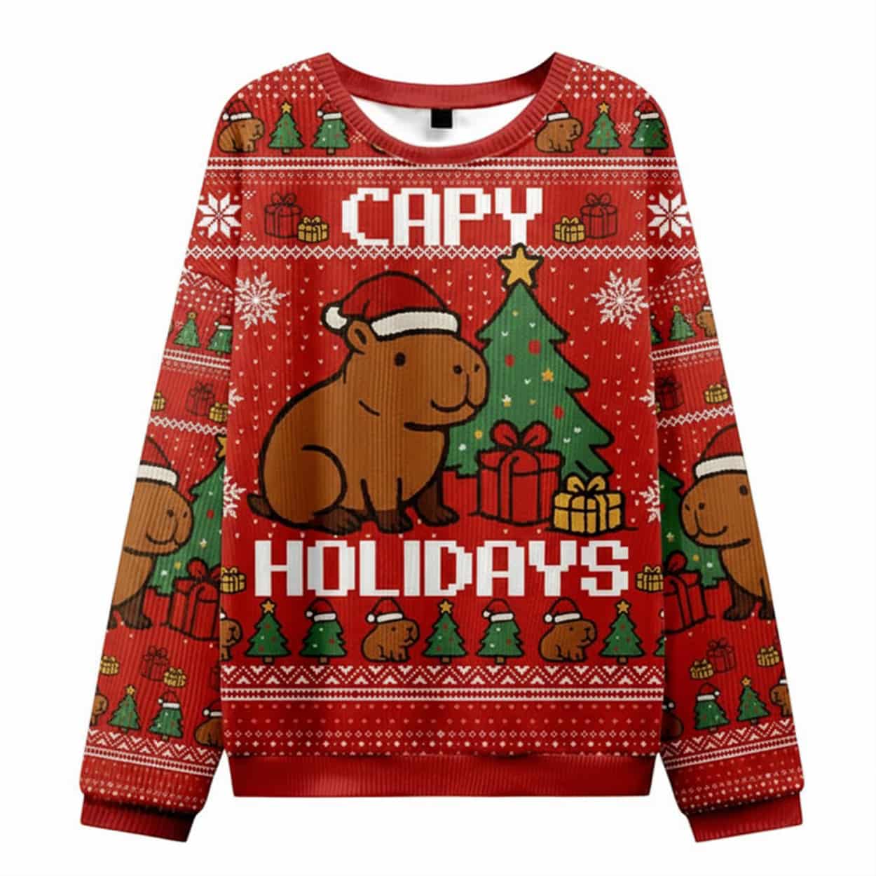 This sweater is a wonderful celebration of two beloved traditions: the fun of the ugly sweater party and the internet’s massive appreciation for the capybara. It’s the ultimate holiday apparel for the animal lover, the person who is always up-to-date on memes, or anyone who wants to bring a unique and lighthearted piece to their next festive gathering. It perfectly captures a quirky, joyful, and very “chill” holiday vibe.