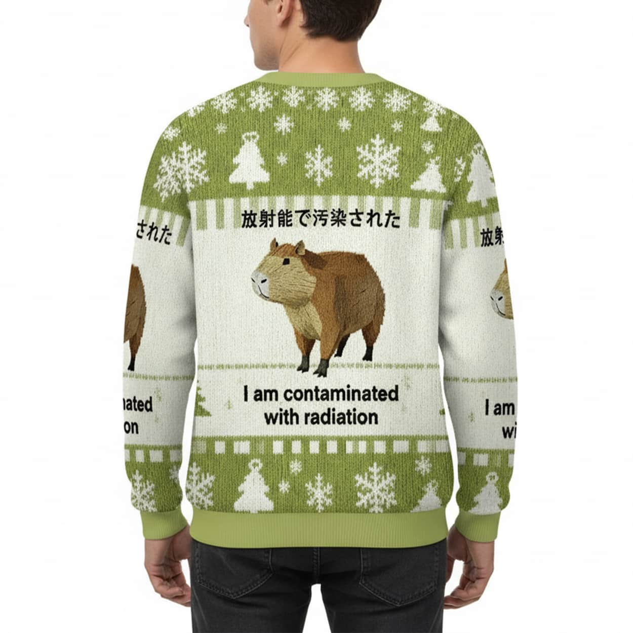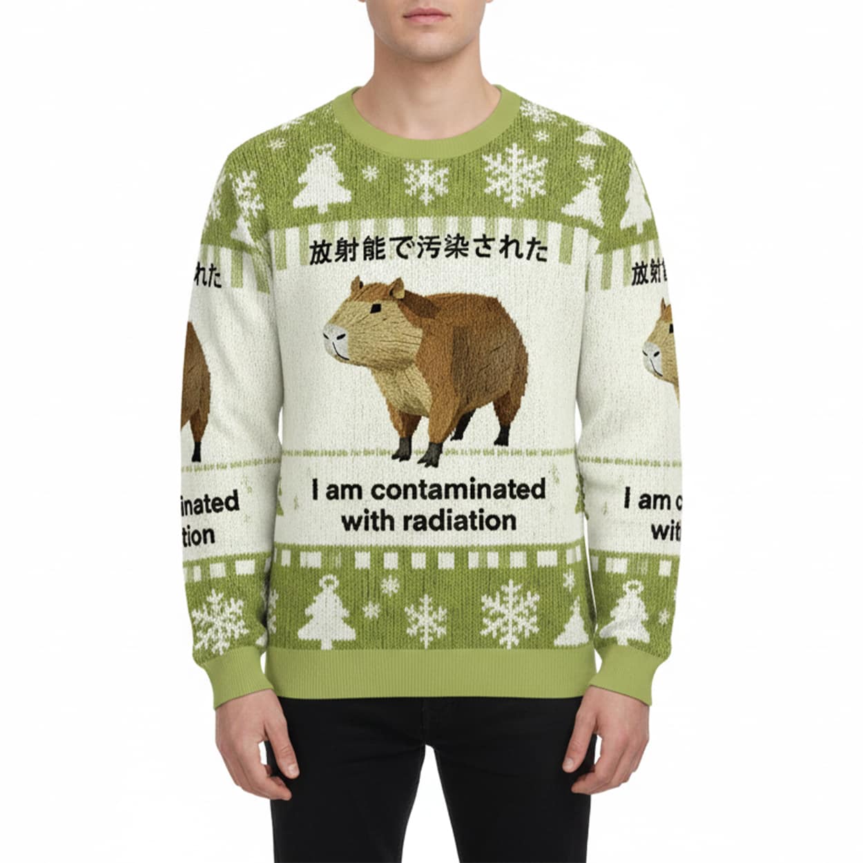 Featuring a stoic capybara front and center, this sweater pairs traditional Christmas motifs—snowflakes, pine trees, and cozy knit patterns—with a jarring bilingual warning: “放射能で汚染された” and its English translation, “I am contaminated with radiation.” The juxtaposition of cuddly capybara and nuclear hazard creates a surreal, meme-worthy masterpiece. The green and white palette keeps it wintery, while the message keeps it weird.