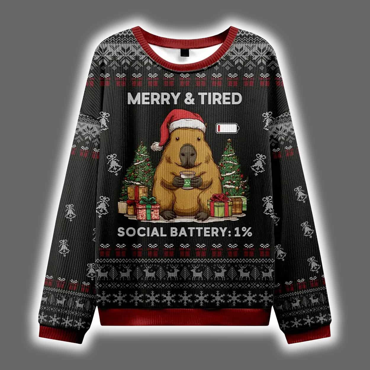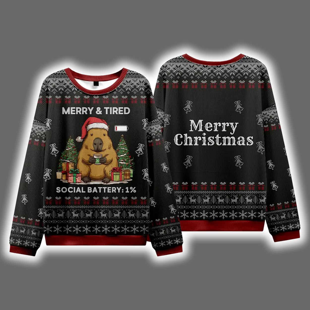 Recharge your holiday spirit with the Capybara Merry & Tired Social Battery 1% Ugly Christmas Sweater—a hilariously relatable twist on festive fashion for introverts and party-goers alike.