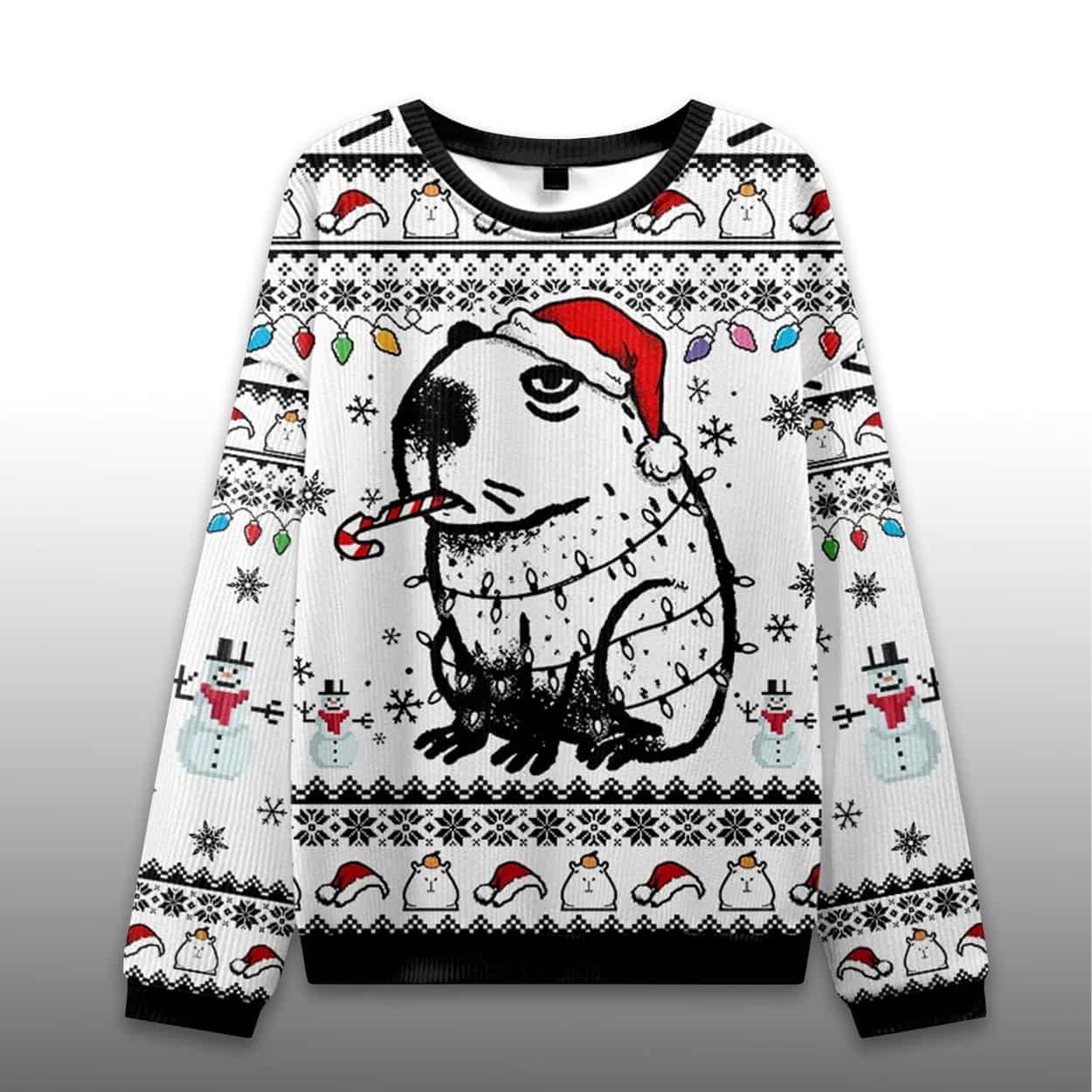 This Capybara Smoking Ugly Christmas Sweater is printed with an all-over holiday pattern in black, white, and red, featuring the most relaxed rodent in the animal kingdom. The center graphic is a large, placid capybara wrapped in colorful Christmas lights, sporting a Santa hat, and holding a striped candy cane in its mouth like a cigar. The background is filled with repeating motifs like pixelated snowmen, twinkling lights, and holiday caps, creating a busy, funny, “ugly sweater” aesthetic.