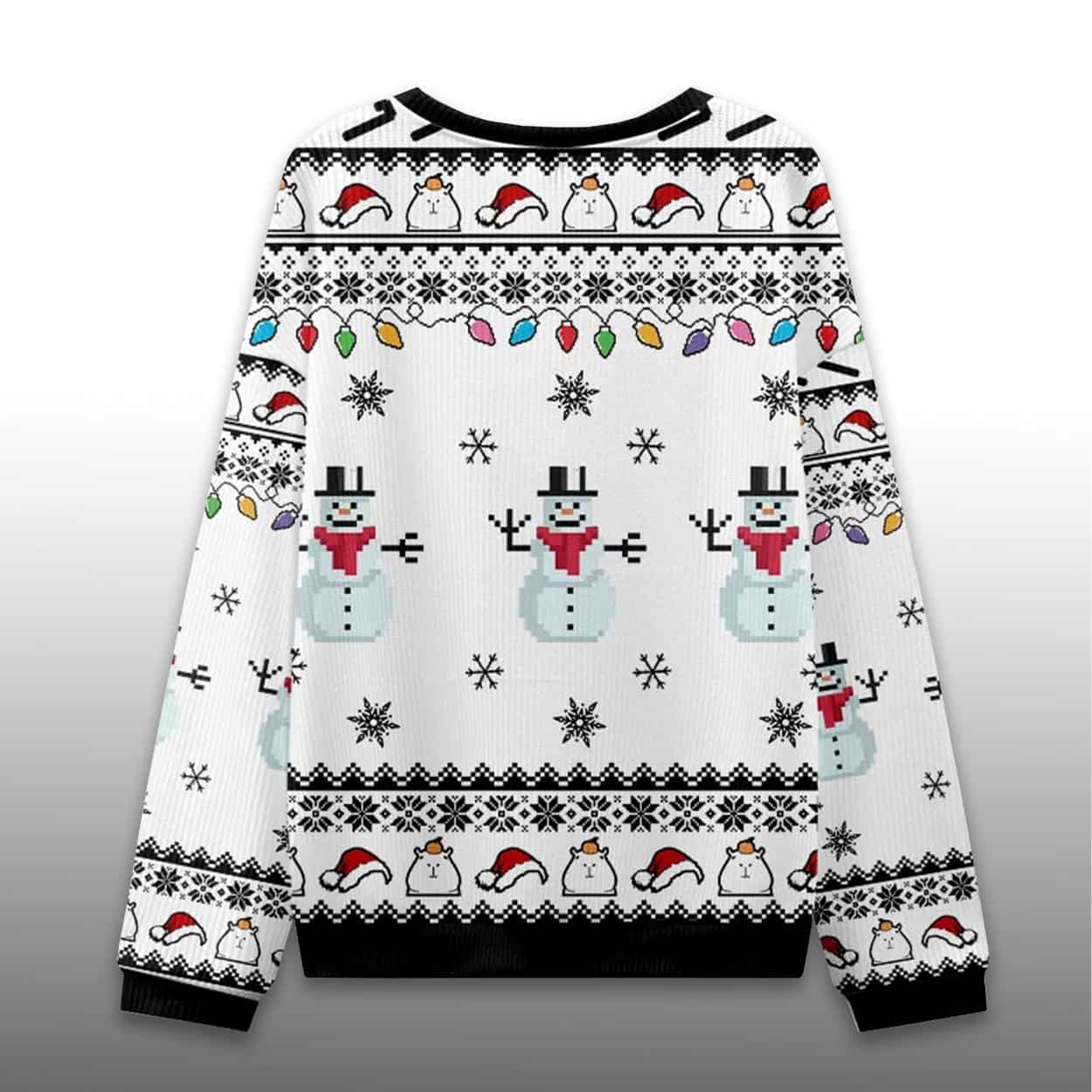 Embrace peak absurdity with the Capybara Smoking Ugly Christmas Sweater! This sweater features a large, chill capybara wearing a Santa hat, tangled in lights, and calmly enjoying a candy cane “cigar”. The background is adorned with pixel-art snowmen and fairy lights. Perfect for winning your next ugly sweater contest with maximum originality.