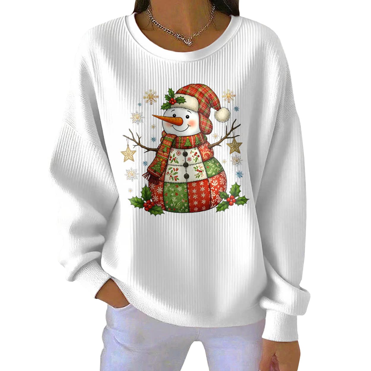Get ready to sleigh the holiday season with this sweatshirt. This winter-ready white ribbed top features a delightfully whimsical snowman front and center, decked out in patchwork patterns of red, green, and white. With a red plaid hat and scarf, twiggy arms, and a classic carrot nose, this frosty friend is surrounded by golden stars and sprigs of holly—bringing instant cheer to any chilly day. The striped detailing on the sleeves adds a sporty twist, making it perfect for festive outings or cozy nights in.