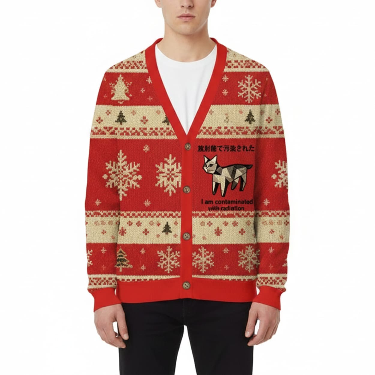 Step aside, traditional holiday sweaters—there’s a new alpha in town. This cardigan is a riotous blend of seasonal charm and radioactive absurdity. Featuring a wide-eyed, slightly deranged cat with a neon-green glow and jagged fur, this cardigan screams “I survived the lab experiment and still made it to Christmas dinner.” Surrounding the feline are chaotic snowflakes, hazard symbols, and glitchy pixel patterns that add to the nuclear narrative. The bold text reads: “CAT CONTAMINATED BY RADIATION,” making it clear this isn’t your grandma’s holiday knit.