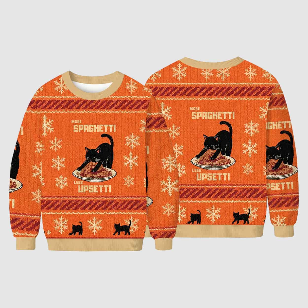 Looking for a holiday sweater that’s as bold and hilarious as your personality? Meet this sweater—a vibrant orange masterpiece that blends cozy winter vibes with internet humor. Adorned with snowflakes and mischievous black cats, the centerpiece of this sweater is a delightfully absurd image: a black cat perched atop a plate of spaghetti, staring with unapologetic sass. Framed by the cheeky phrase “MORE SPAGHETTI, LESS UPSETTI,” it’s a wearable meme that turns heads and lifts spirits.