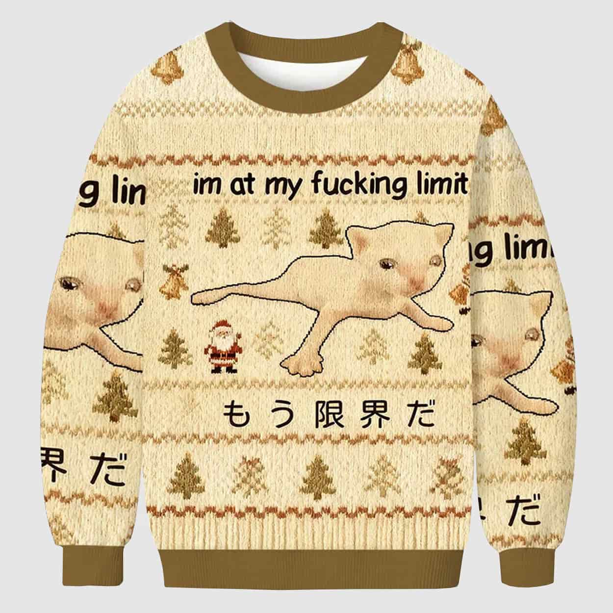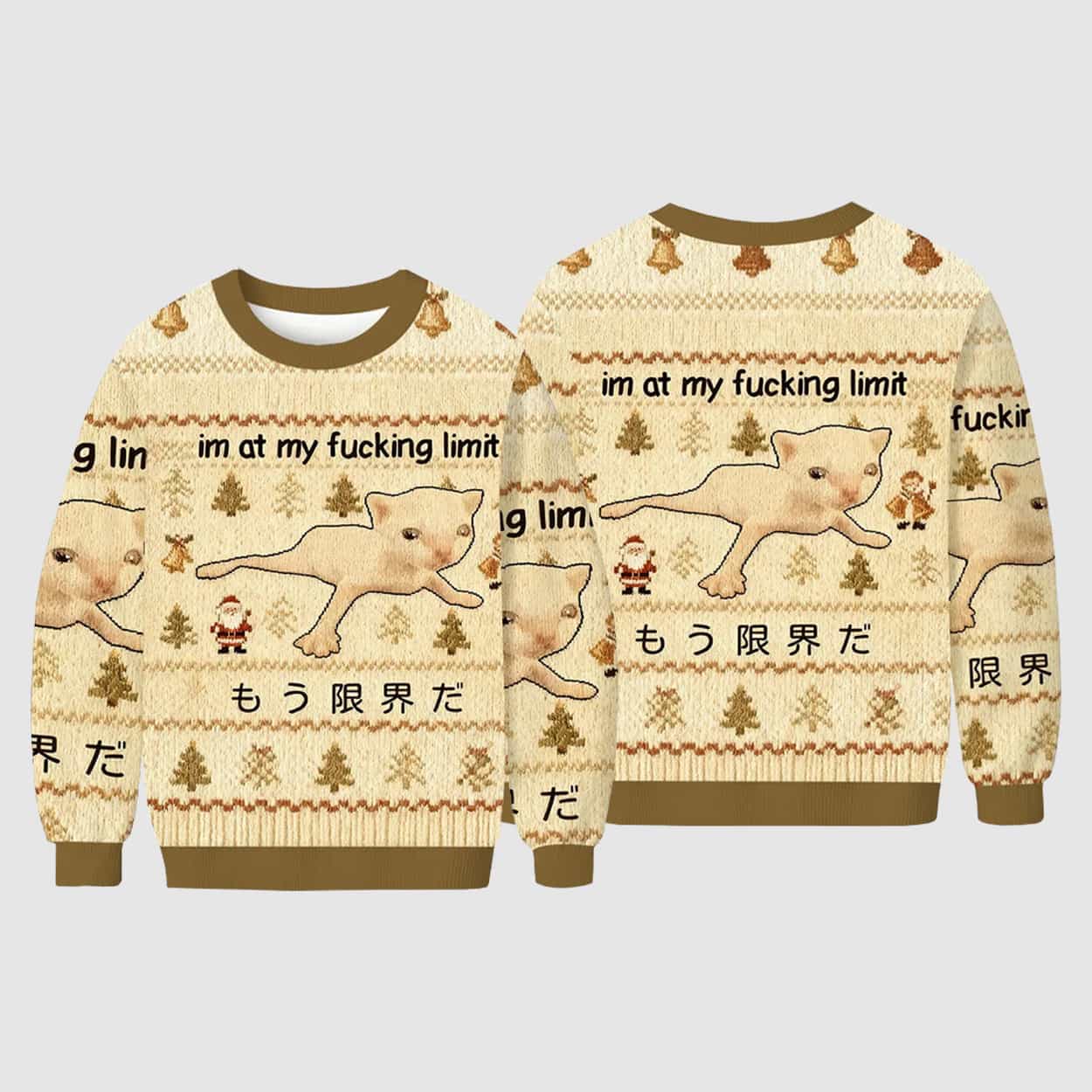 This isn’t your grandma’s Christmas sweater. This sweater blends traditional holiday knitwear vibes with unapologetic internet humor. Set against a cozy winter-themed backdrop, the design features a frantic cartoon cat mid-sprint, eyes wide with existential dread. Surrounding it are whimsical trees and a mischievous gnome-like figure, adding layers of absurdity. Boldly printed across the chest is the cathartic phrase “im at my fcking limit,” paired with Japanese text reading “もう限界だ” — a direct translation of “I’m at my limit.” It’s the perfect visual for anyone who’s barely holding it together this season.