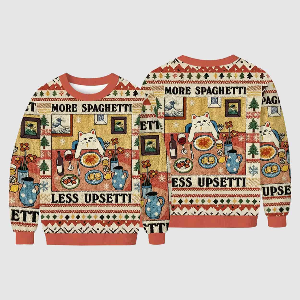 Get ready to stir up some holiday joy with this sweater. This vibrant design features a cartoon cat seated at a festive dinner table, surrounded by spaghetti, utensils, framed pictures, and holiday icons like snowflakes and Christmas trees. With a warm yellow backdrop and red-green accents, it radiates cozy vibes while boldly declaring its message: “MORE SPAGHETTI, LESS UPSETTI.” It’s a wearable punchline that combines seasonal spirit with internet humor.
