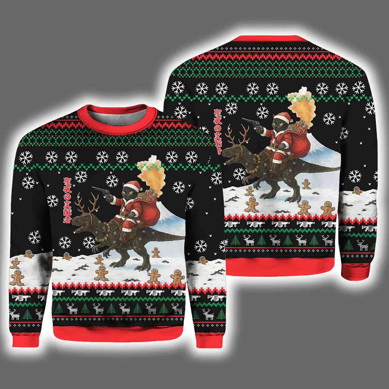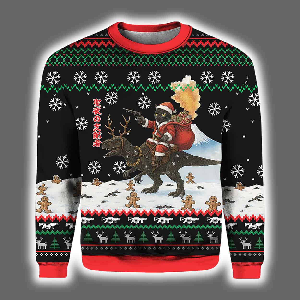Forget everything you thought you knew about holiday fashion—this sweater is here to rewrite the rules. Front and center, a fearless feline clutches the reins of a roaring dinosaur, galloping through a snowy wonderland like it owns the season. Santa hats? Check. Snowflakes? Everywhere. Gingerbread men? Scattered like confetti. The sweater bursts with classic Christmas icons—trees, reindeer, and snowflakes—layered in red, green, and white against a bold black canvas. Red accents on the collar, cuffs, and hem add a punch of festive flair. It’s not just ugly—it’s gloriously chaotic.