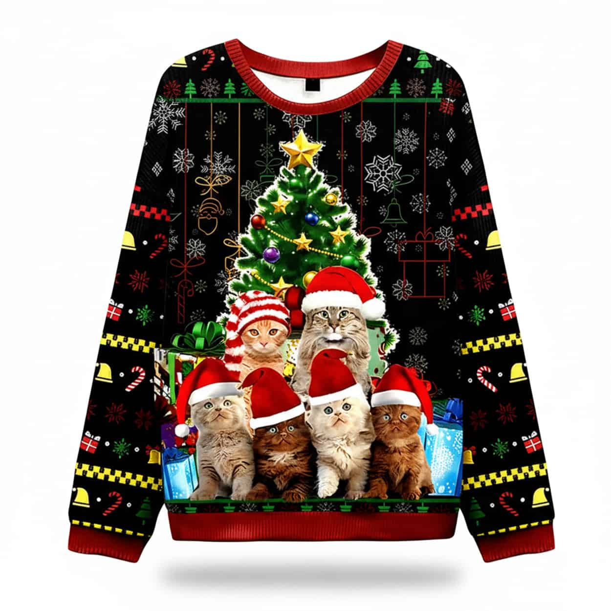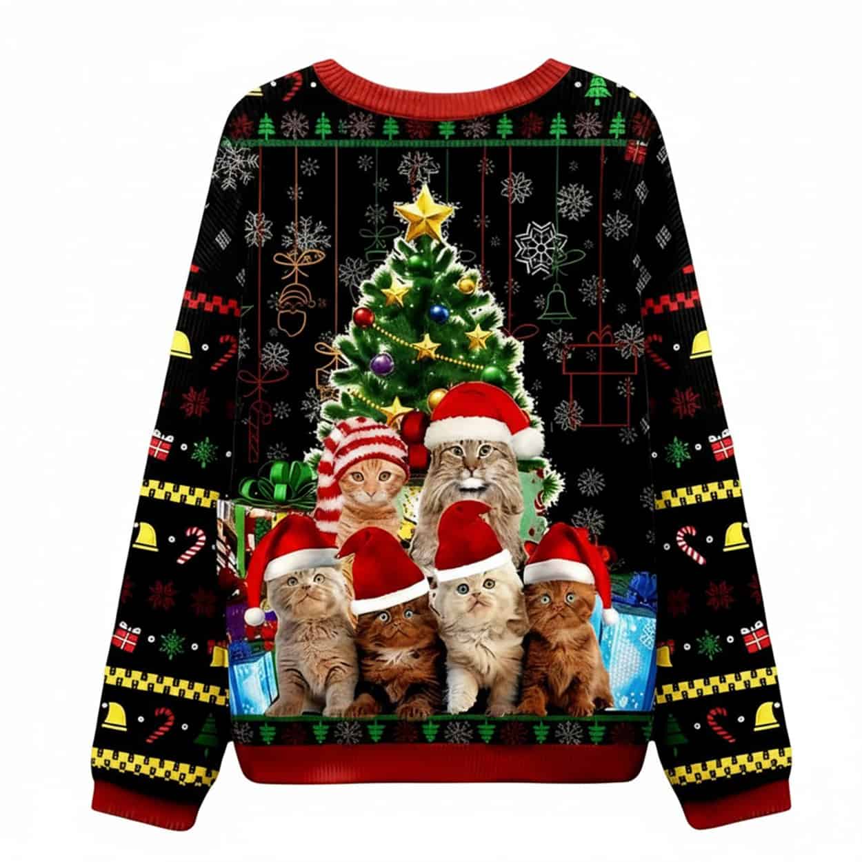 This pullover is the purr-fect choice for your next holiday gathering, blending a classic “Ugly Christmas Sweater” look with adorable feline charm. The festive black sweater features a bright red trim and is covered in repeating holiday patterns like snowflakes, bells, presents, and candy canes. The heartwarming main graphic shows a “family” of five cats and kittens, all wearing Santa hats, gathered in front of a beautifully decorated Christmas tree.