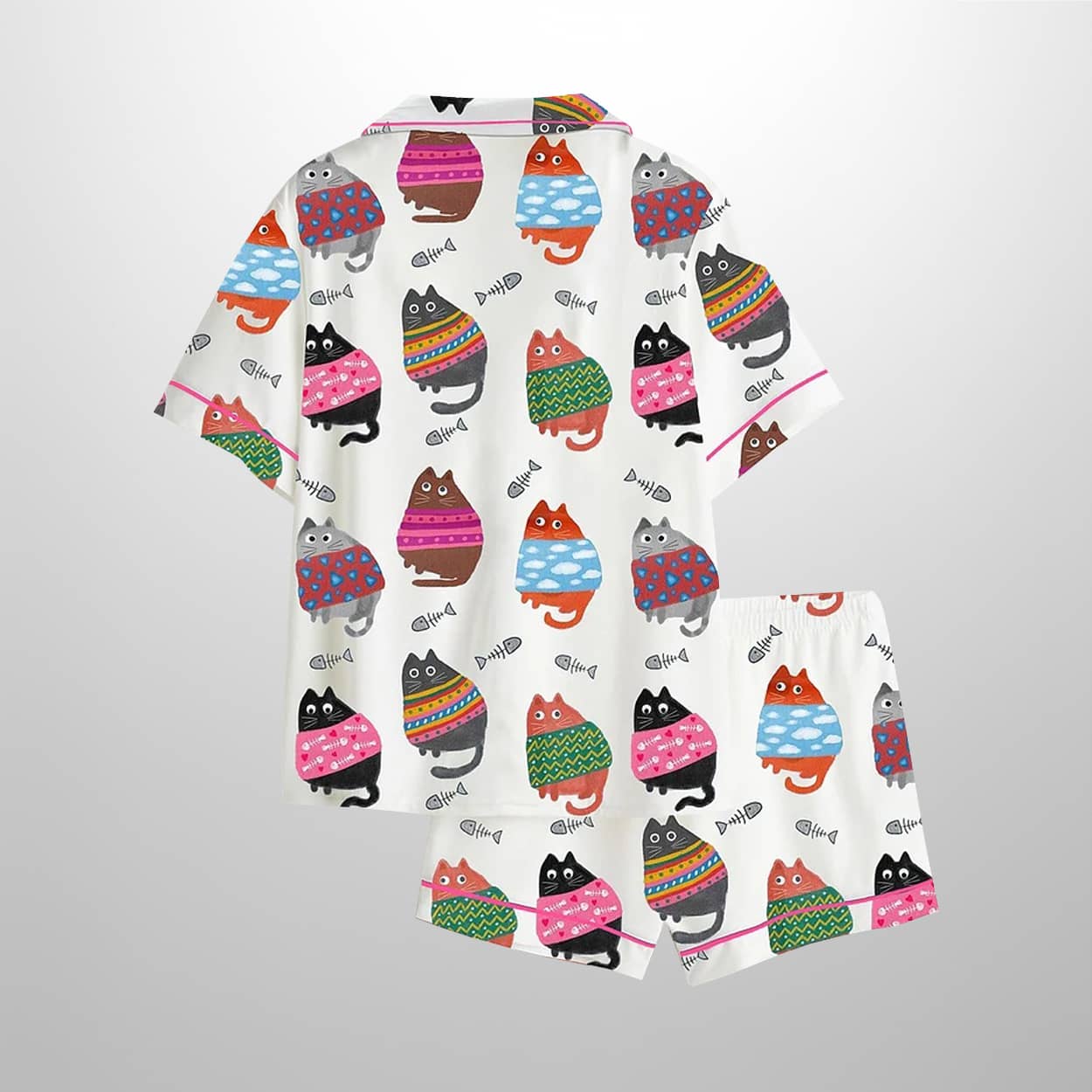 Add a splash of feline fun to your bedtime routine with this pajama set. This delightful duo features a short-sleeved button-up shirt and matching shorts, both adorned with a whimsical parade of cartoon cats dressed in vibrant, patterned sweaters. From zigzags to stripes in pinks, blues, greens, and oranges, each cat brings its own personality to the party. The crisp white background lets the colorful characters pop, while the pink piping along the collar, button line, and sleeve edges adds a sweet finishing touch. It’s cozy, cheeky, and undeniably charming.
