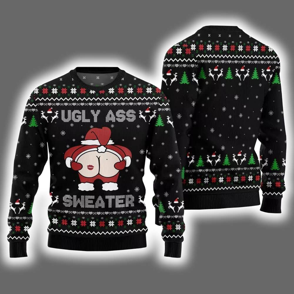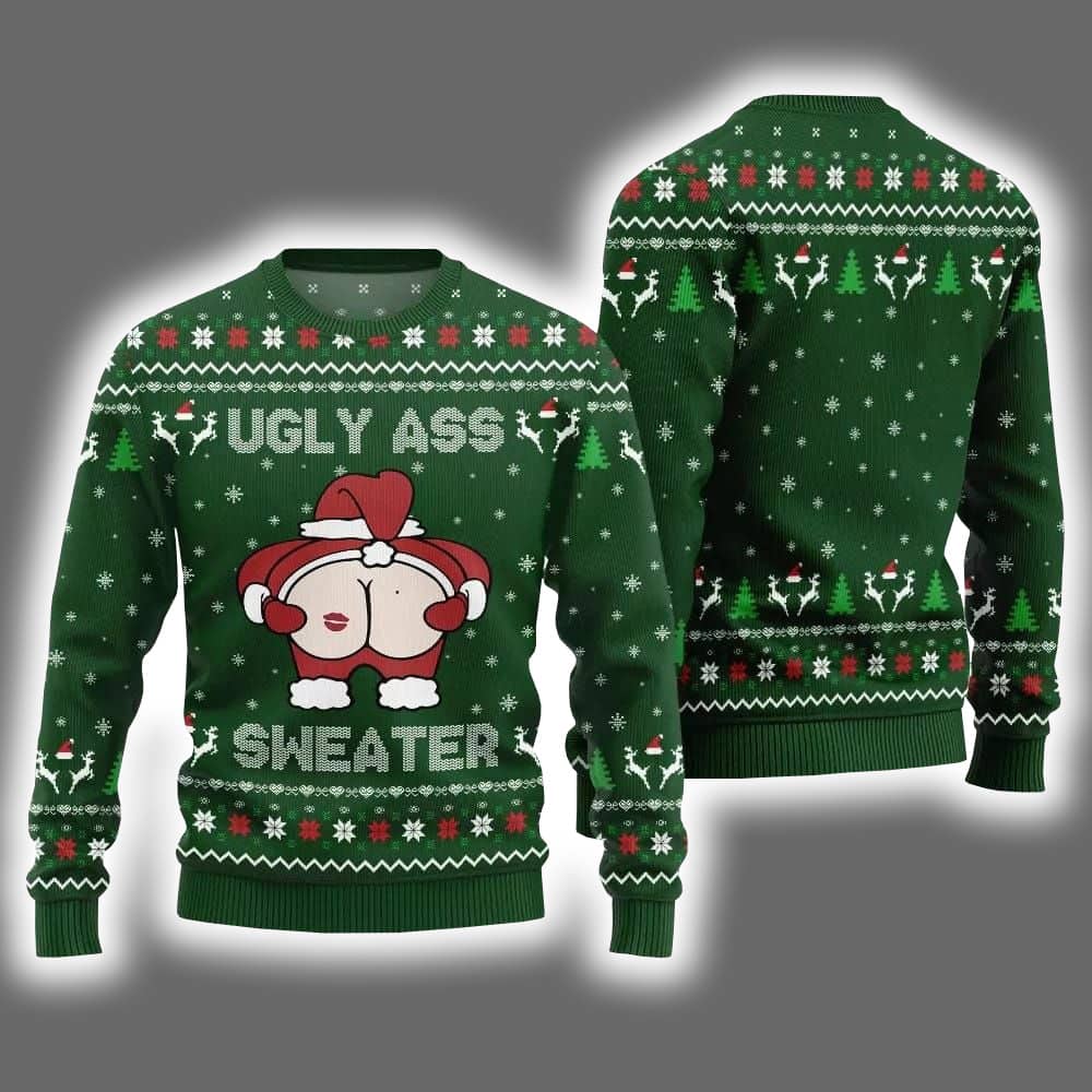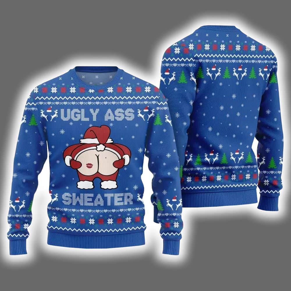 Get ready to sleigh the holiday season with the Caught Kissing Santa Ugly Christmas Sweater—a hilarious and daring take on festive wear. Front and center is a cartoon Santa caught mid-bend, cheekily exposing his rear end, framed by the bold phrase “UGLY ASS SWEATER” in crisp white lettering. Traditional holiday motifs like snowflakes, reindeer, and Christmas trees add a classic touch to the sleeves and hem, making this sweater a perfect blend of irreverence and nostalgia.