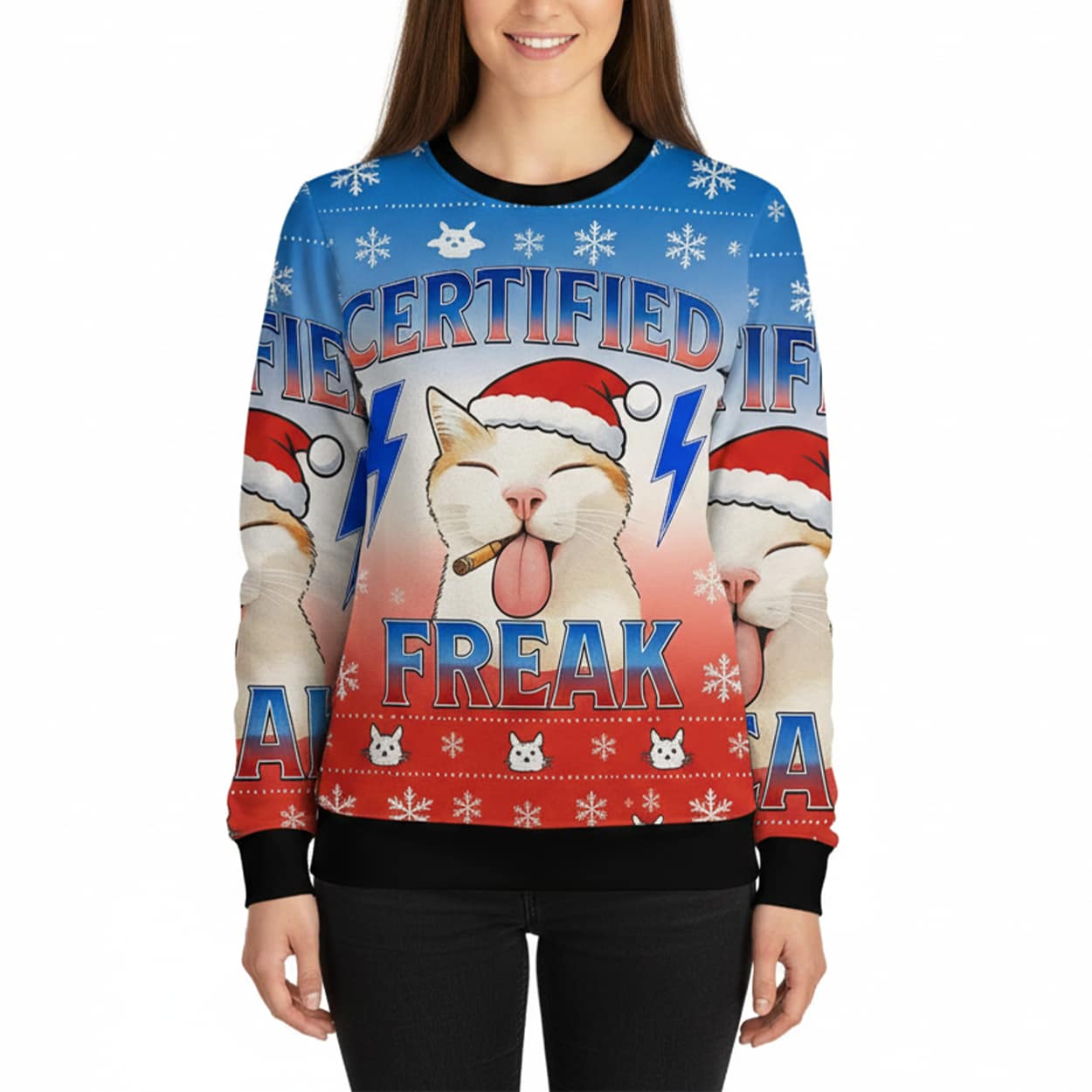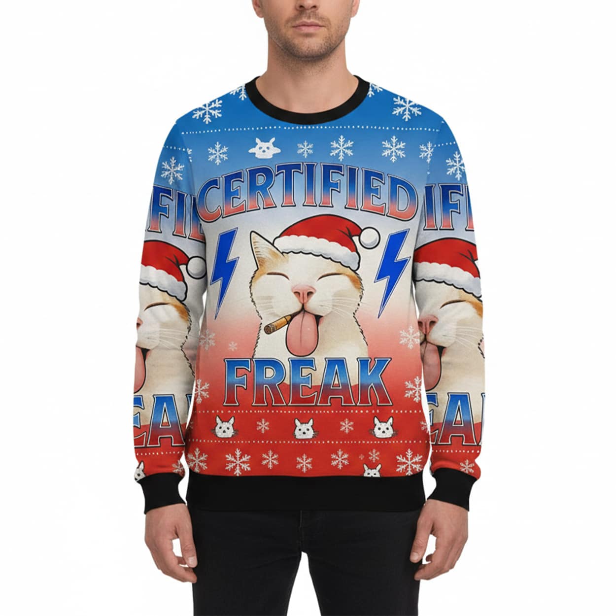 This isn’t just a sweater — it’s a declaration of festive mischief. This sweater features a delightfully deranged feline front and center, eyes closed and tongue out, rocking a Santa hat like it’s the peak of party season. The background fades from icy blue to fiery red, sprinkled with snowflakes, lightning bolts, and tiny cat faces that add layers of chaotic charm. Boldly emblazoned across the chest is the phrase “CERTIFIED FREAK” in unapologetic block letters, making it clear you’re not here for silent nights — you’re here to sleigh.