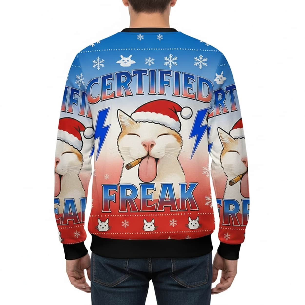 Unleash your inner holiday rebel with the Certified Freak Cat Ugly Christmas Sweater — a bold, hilarious twist on festive fashion that’s guaranteed to turn heads and spark laughter.