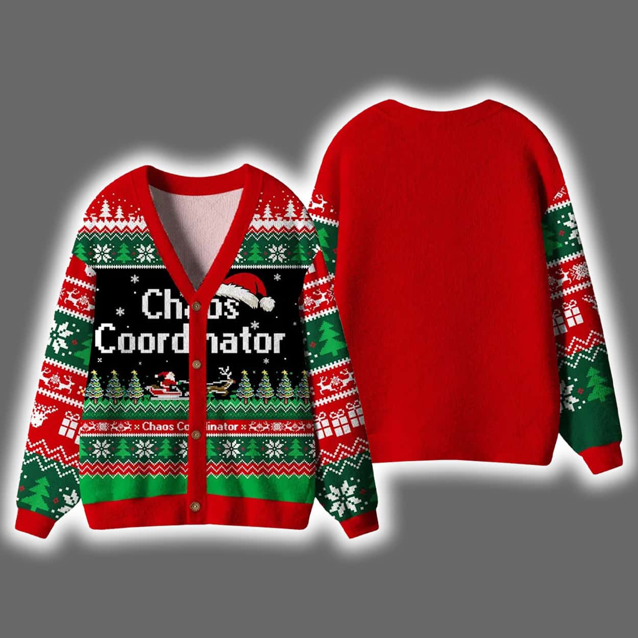 Step into the holiday spotlight with this cardigan—a vibrant, cheeky tribute to the unsung heroes of seasonal madness. The front bursts with classic Christmas motifs: snowflakes, zigzag stripes, and evergreen trees in bold reds, greens, blacks, and whites. Front and center, the phrase “Chaos Coordinator” steals the show, topped with a Santa hat on the “S” and a jolly Santa figure tucked into the design. The back keeps things simple with a solid red canvas, while the sleeves echo the front’s festive pattern, tying the whole look together in perfect holiday harmony.