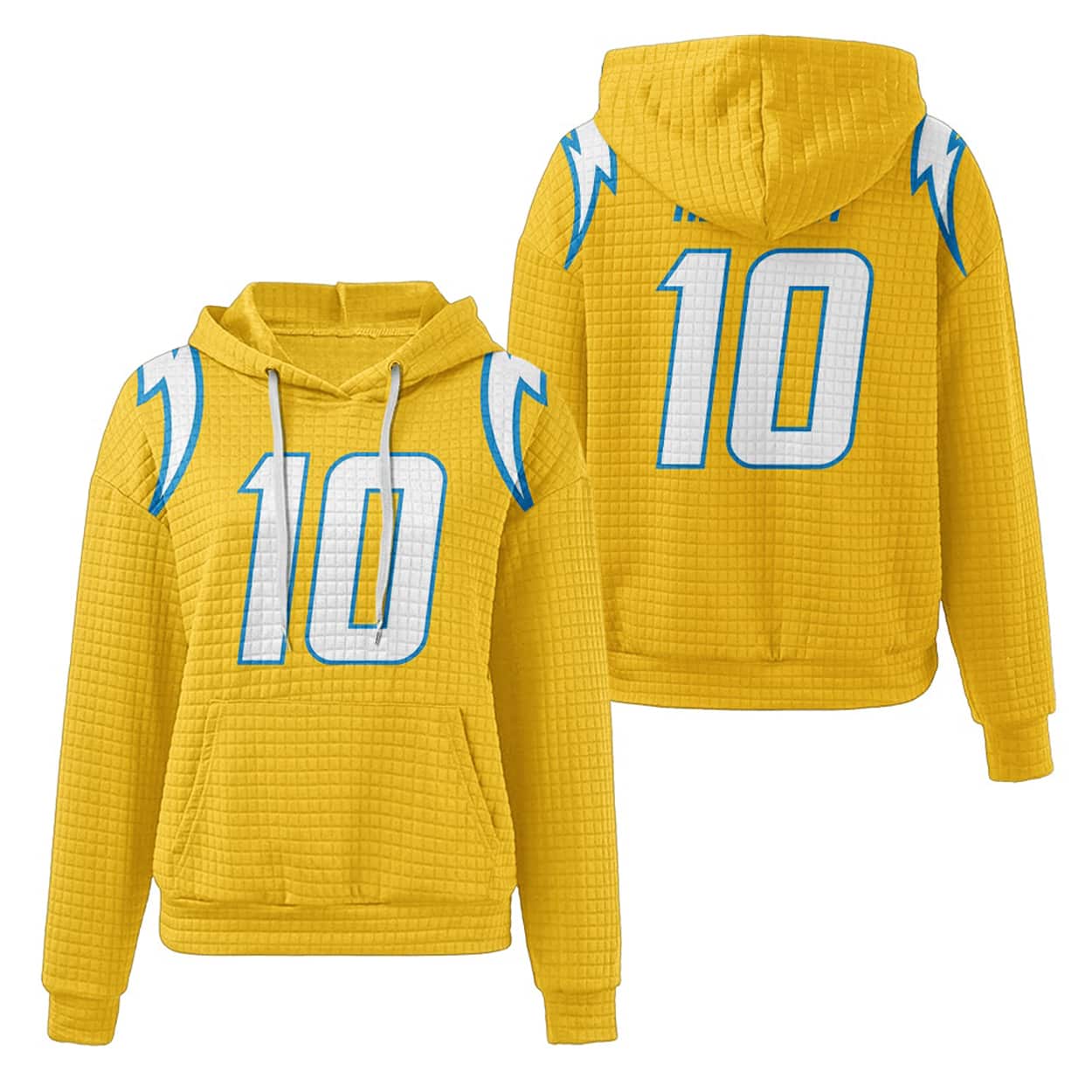 Get ready to light up the stands in this hoodie. Drenched in deep blue and accented with crisp white drawstrings, this hoodie is a visual touchdown. The number “10” takes center stage on both the front and back, outlined in white and yellow for a high-voltage look. Yellow lightning bolts blaze across both shoulders, giving the hoodie a jolt of Chargers energy that’s impossible to ignore. Whether you’re cheering from the couch or the bleachers, this hoodie makes sure your loyalty is loud and clear.
