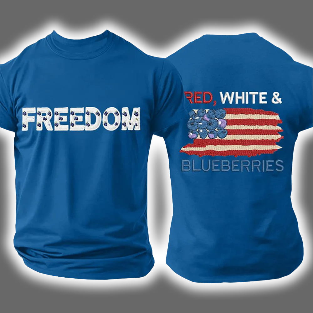 Turn heads and spark conversations with this two-sided shirt. On the front, the word “FREEDOM” blazes across your chest in bold capital letters, filled with a vibrant American flag pattern—stars, stripes, and all. Flip it around and you’ll find a playful twist: a stylized flag made of juicy blueberries and golden pie crust stripes. Above it, the phrase “RED, WHITE &” sets the stage, while “BLUEBERRIES” seals the deal below.