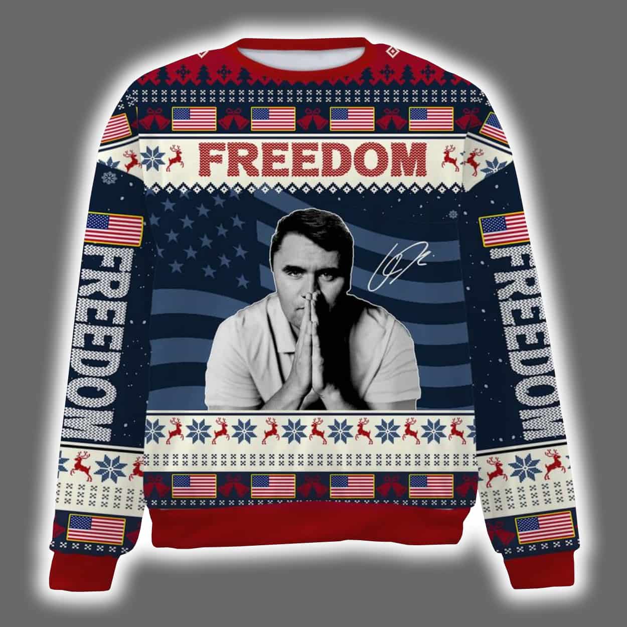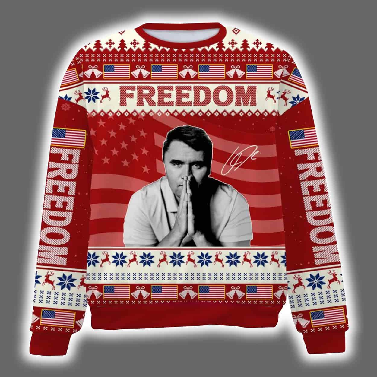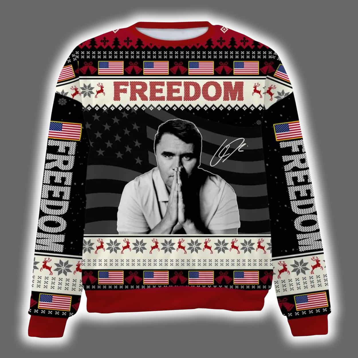Step into the season with a sweater that’s anything but silent night. This sweater features a powerful black-and-white portrait of Charlie Kirk in a contemplative pose, hands clasped beneath the bold word “FREEDOM.” Behind him, the American flag waves proudly, anchoring the design in patriotic symbolism. The sleeves echo the theme with vertical “FREEDOM” text and flag motifs, while classic holiday patterns—snowflakes, reindeer, and geometric shapes—add a festive twist in red, white, and black. It’s a visual mashup of conviction and celebration, designed to turn heads and spark conversation.