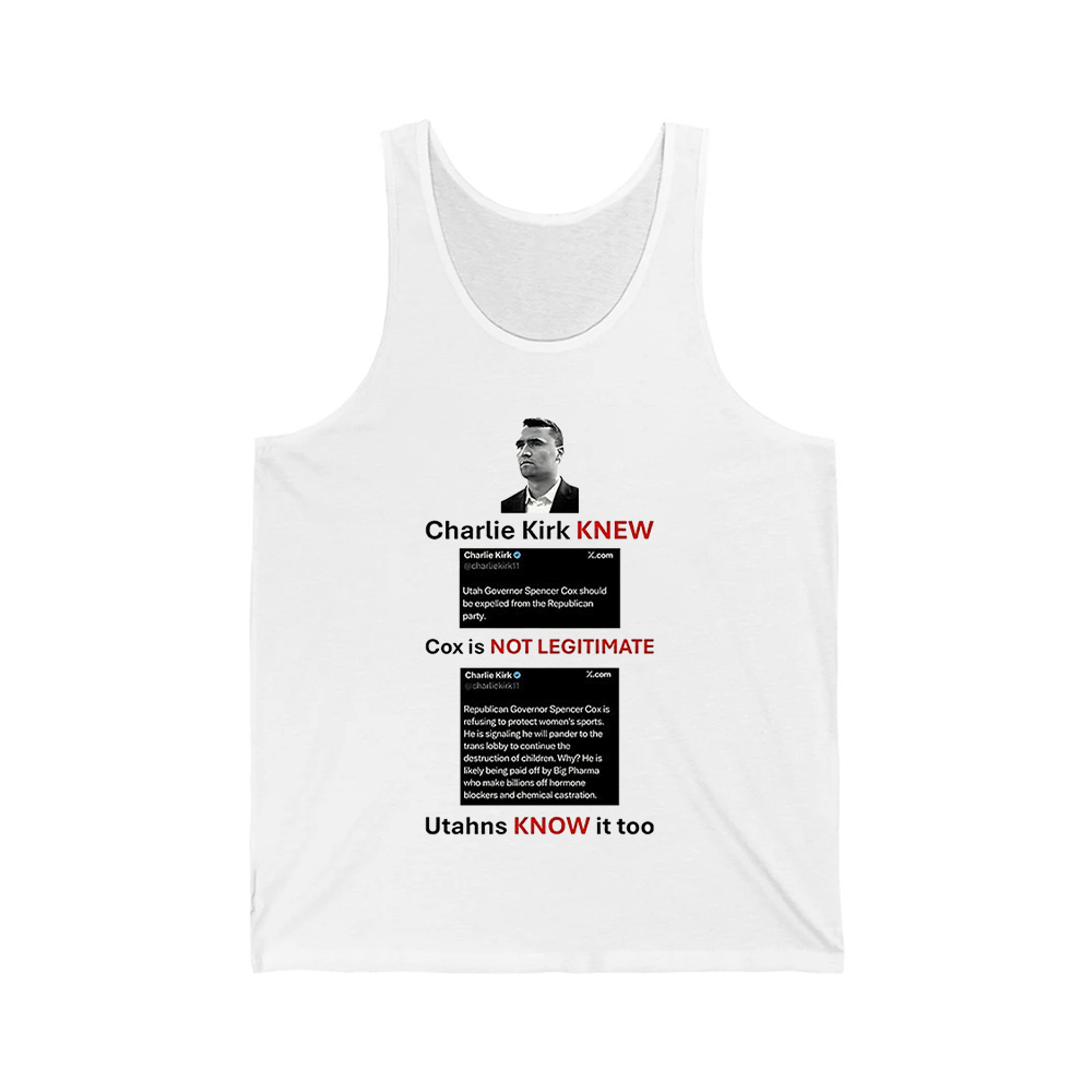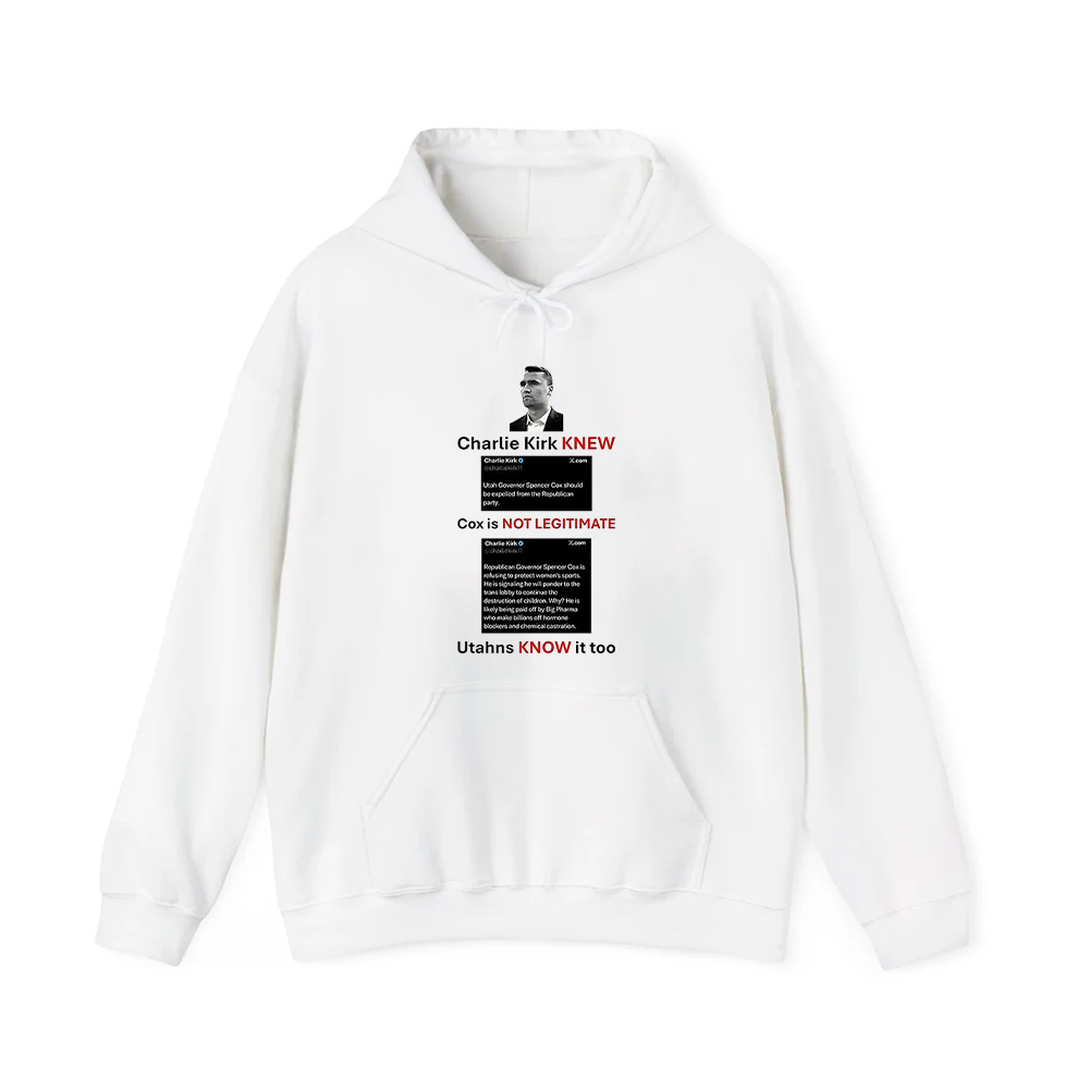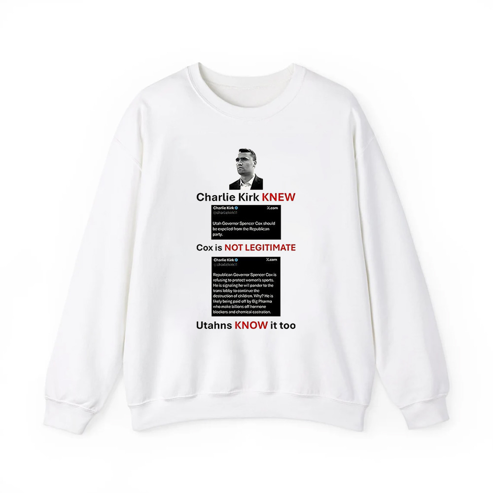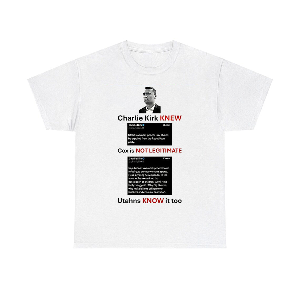 This shirt isn’t just clothing—it’s a megaphone. Featuring a black-and-white image of a suited man and three bold declarations—“Charlie Kirk KNEW,” “Cox Is NOT LEGITIMATE,” and “Utahns KNOW it too”—this tee turns heads and sparks conversations. The design includes tweet-style quotes attributed to conservative commentator Charlie Kirk, accusing Utah Governor Spencer Cox of election misconduct.