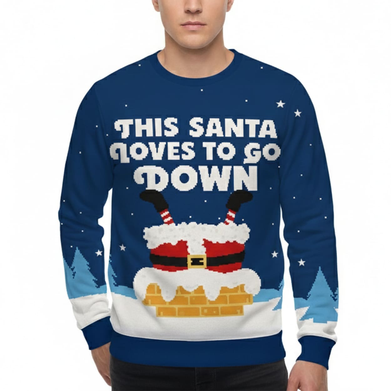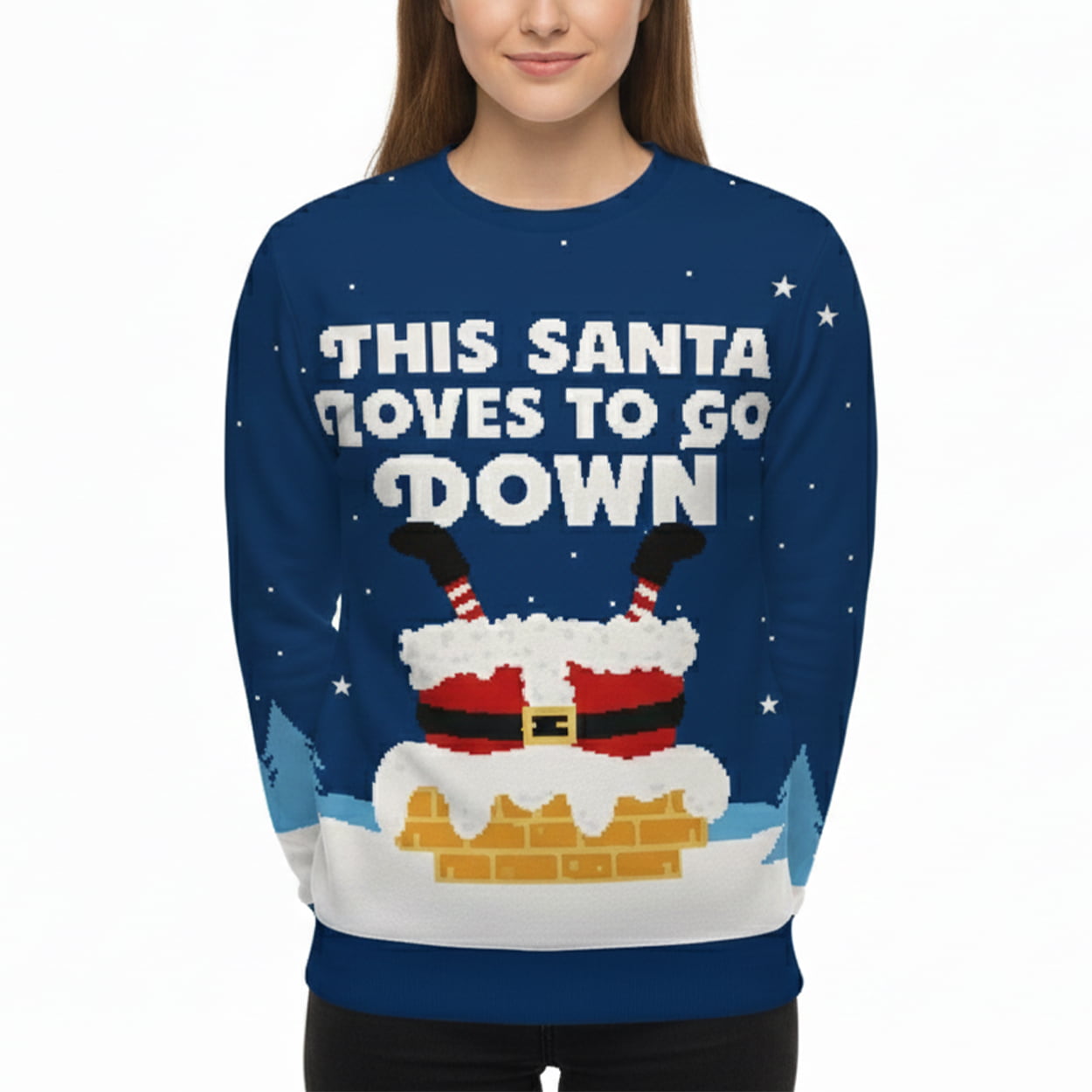 Make spirits bright—and a little mischievous—with this sweater. This dark blue holiday essential is decked out with classic snowflakes and pine trees, but the real showstopper is front and center: Santa’s legs sticking out of a chimney, mid-descent, with the bold caption “THIS SANTA LOVES TO GO DOWN” printed above. It’s a playful twist on tradition that’s guaranteed to get laughs and double takes at every festive gathering.