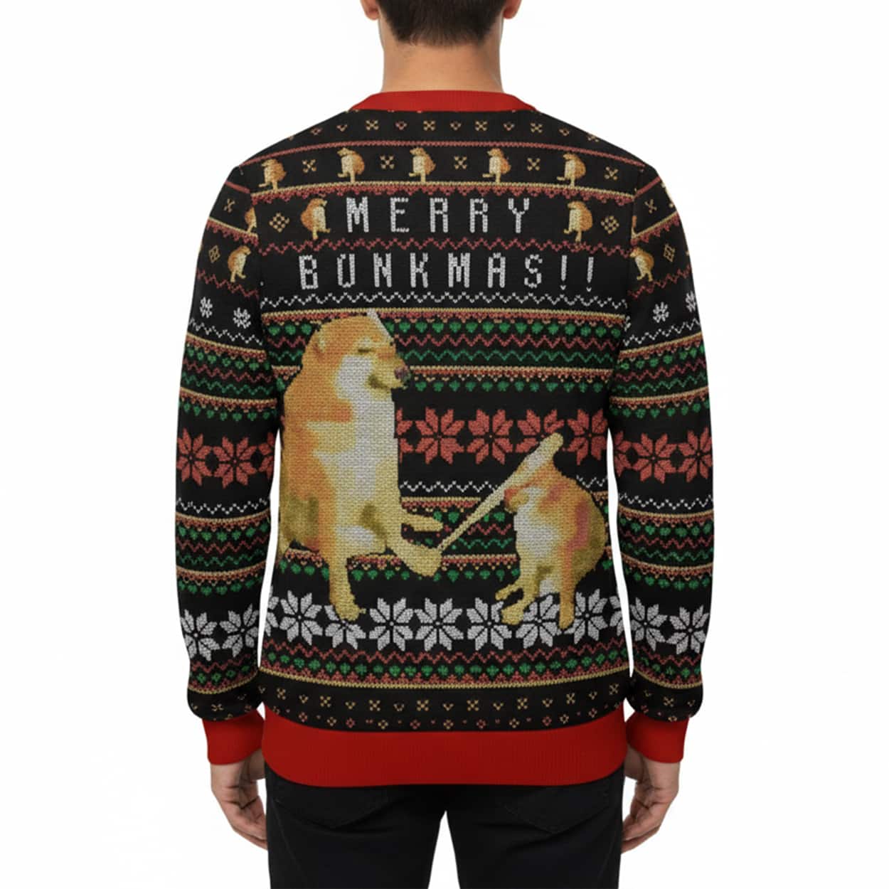 The centerpiece of this sweater is a playful nod to the viral Cheems Doge “bonk” meme. On the left, we see the classic Cheems Doge, famous for his speech impediment and iconic posture. Opposite him, another Doge figure is depicted enthusiastically bonking Cheems, a symbol often used online to humorously redirect impure thoughts or actions. The phrase “MERRY BUNKMAS!!” crowns the image, giving a cheeky, meme-ified twist to the classic holiday greeting. This is not just a sweater; it’s a piece of internet history rendered in festive knit, perfect for those who dare to be different.