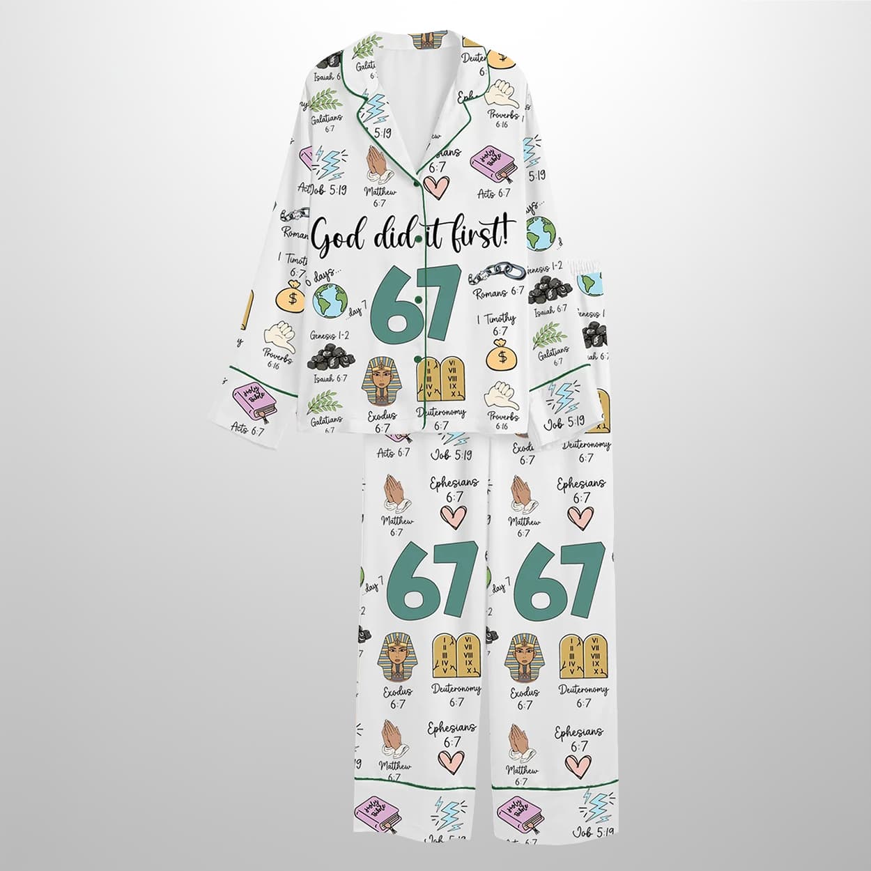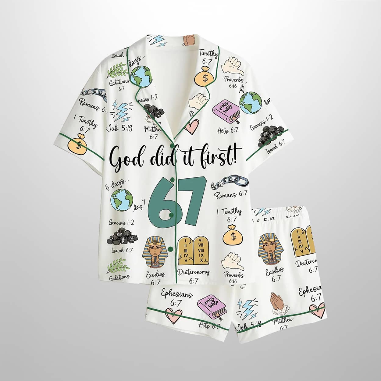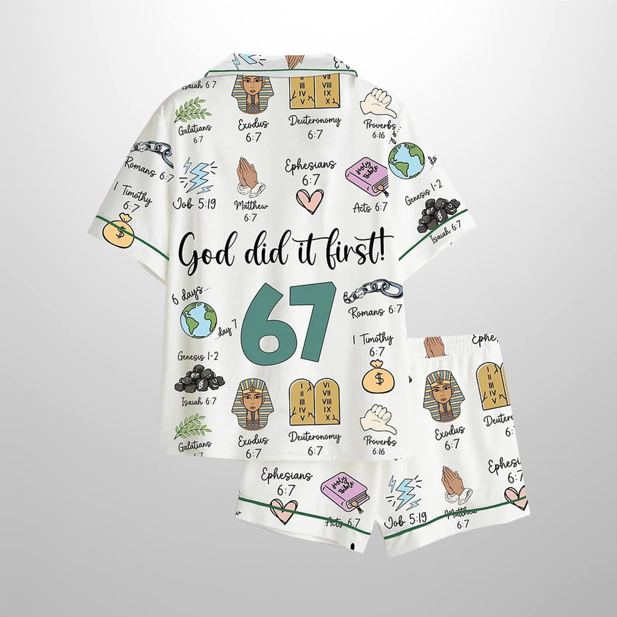 Step into a heavenly slumber with this pajama set—a vibrant, scripture-packed sleepwear ensemble that turns bedtime into a biblical brainstorm. This short-sleeved button-up shirt and matching shorts feature a playful collage of illustrations and verse references, all orbiting the bold proclamation: “God did it first!” Centered around the number “67,” each symbol—from a lion’s head to a scroll—corresponds to chapter 6, verse 7 of various books in the Bible. It’s not just sleepwear—it’s a wearable sermon.