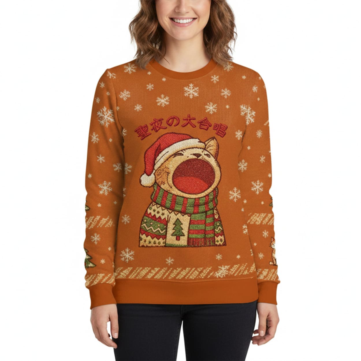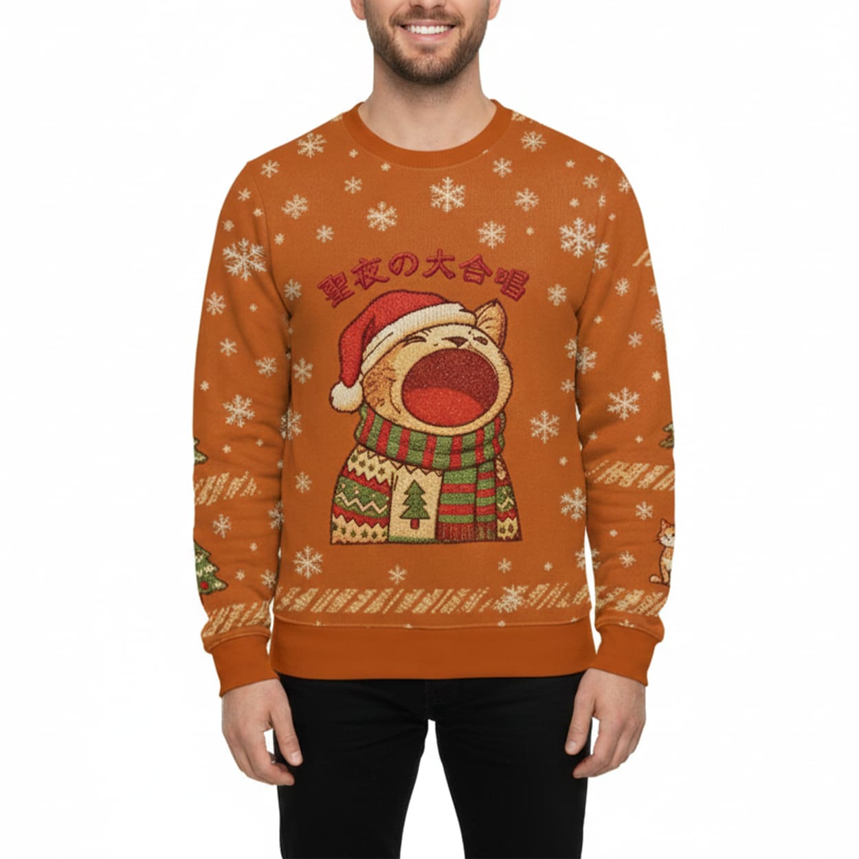 This sweater is a tribute to the unexpected—where holiday tradition meets playful rebellion. The yawning (or singing) cat channels the spirit of those who’d rather nap through the carols or belt out their own tune. The Japanese phrase adds a layer of intrigue, inviting conversation and laughter. It’s perfect for those who embrace the season with humor, curiosity, and a dash of eccentricity.