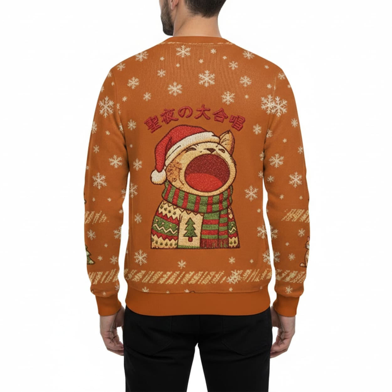 Strike a chord this holiday season with this sweater, a vibrant orange celebration of yuletide whimsy. Snowflakes scatter across the design, framing a central cartoon cat (or bear-like feline) in a Santa hat and striped scarf, mid-yawn or mid-song—depending on your interpretation. Above the character, Japanese text reads “聖夜の犬小屋,” translating to “Holy Night Doghouse,” adding a quirky cultural twist. Candy cane stripes and Christmas tree motifs on the sleeves complete the ensemble, making this sweater a standout hit for parties, gift exchanges, or cozy nights in.