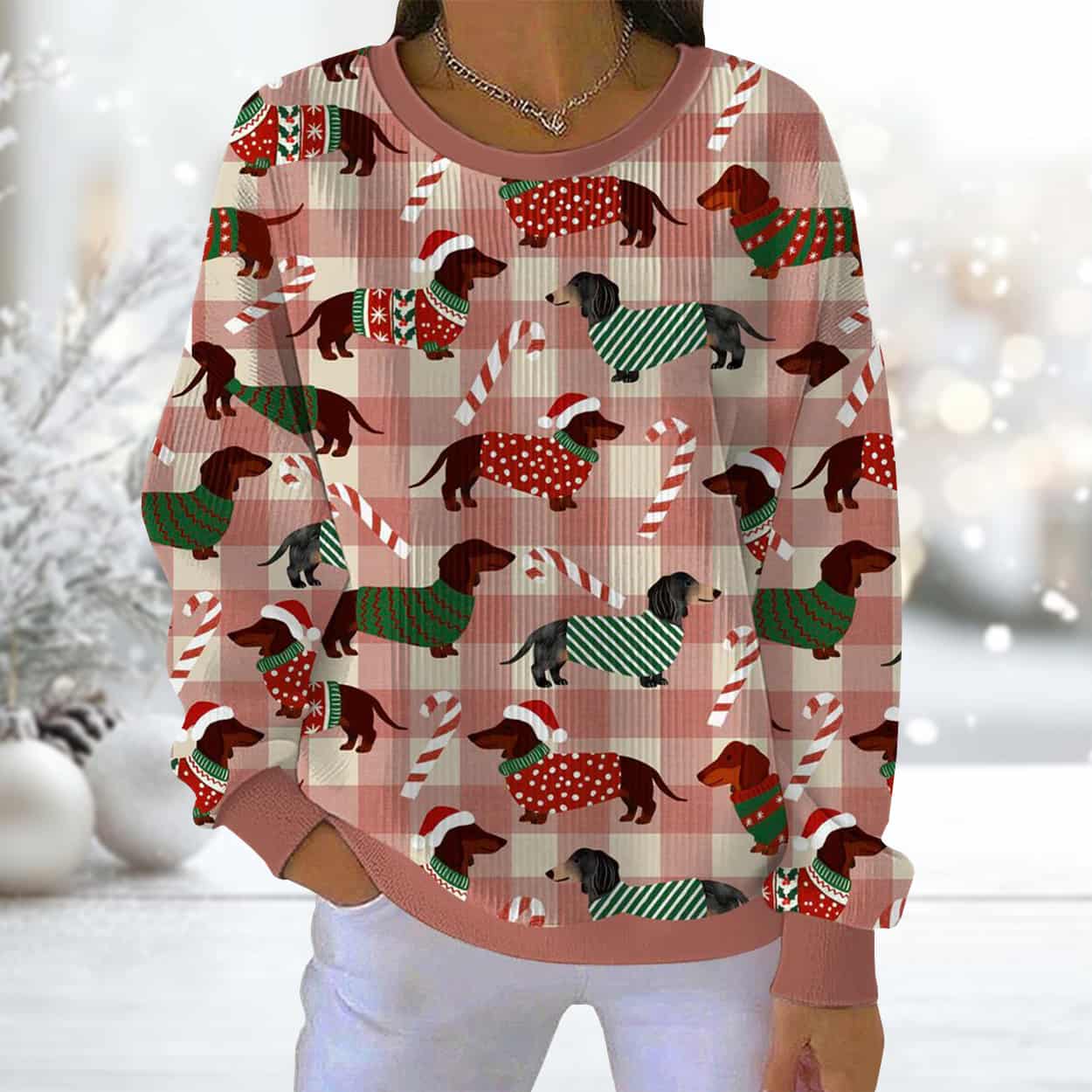 Get ready to sleigh the season in style with this irresistibly festive sweatshirt featuring a parade of dachshunds dressed to impress. Each pup sports its own holiday ensemble—Santa hats, cozy scarves, and cheerful red-and-green sweaters—set against a soft plaid backdrop in shades of pink, white, and beige. The design is a joyful mashup of candy cane stripes and playful pup personalities, making it the perfect conversation starter at any holiday gathering. Whether you’re sipping cocoa by the fire or leading the charge at your office party, this sweatshirt guarantees smiles and compliments.