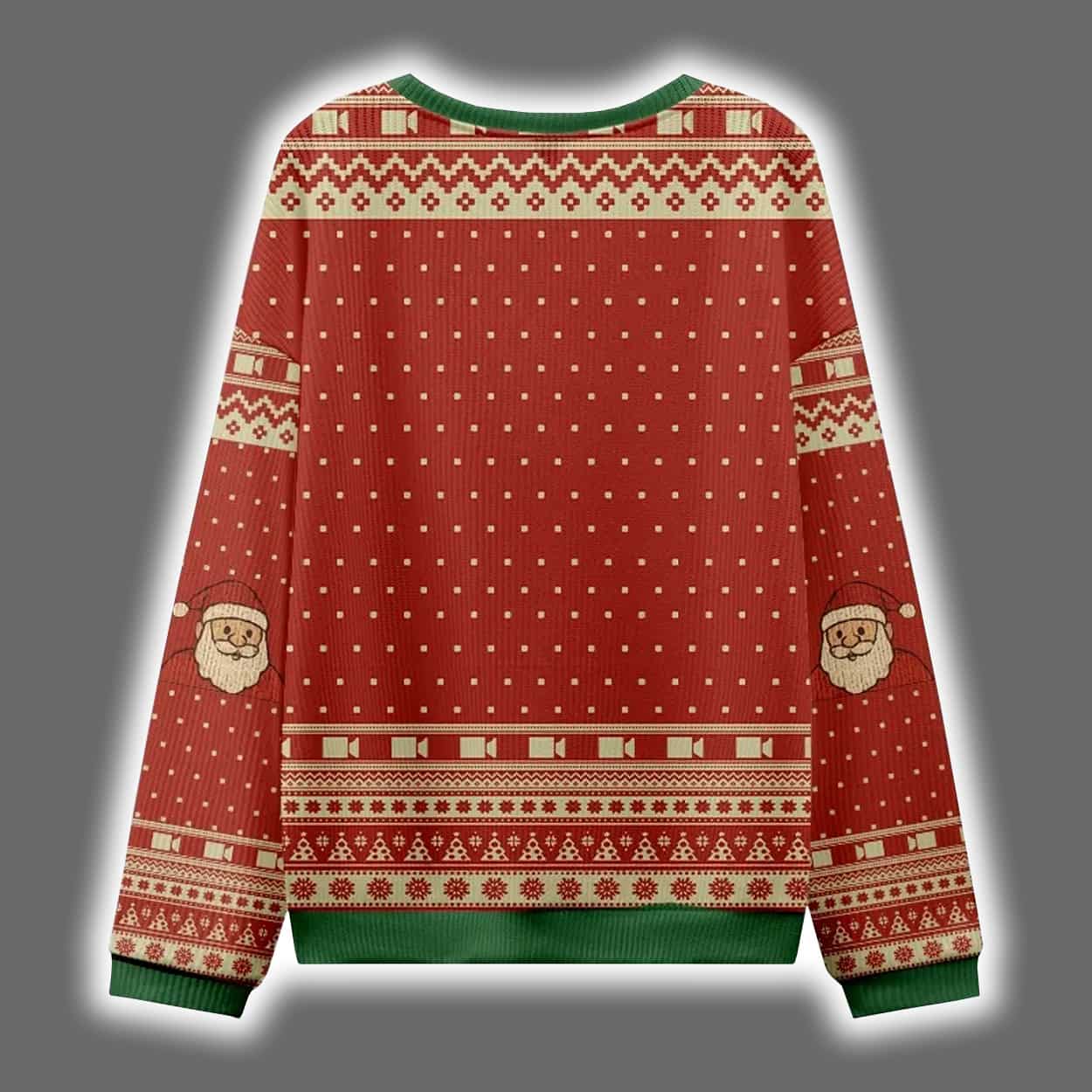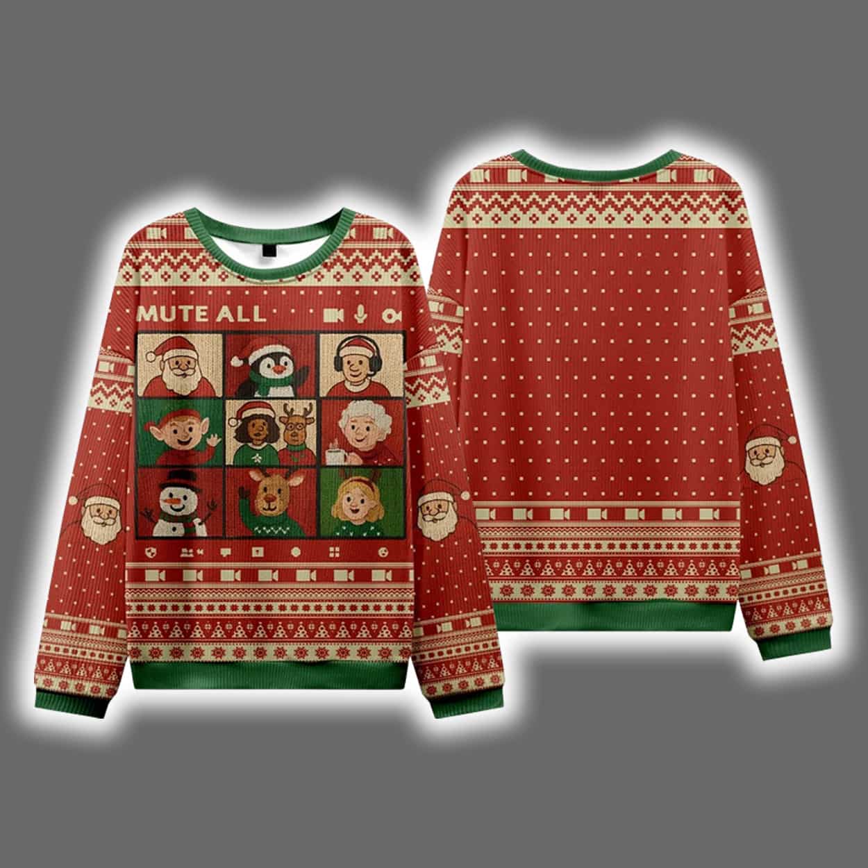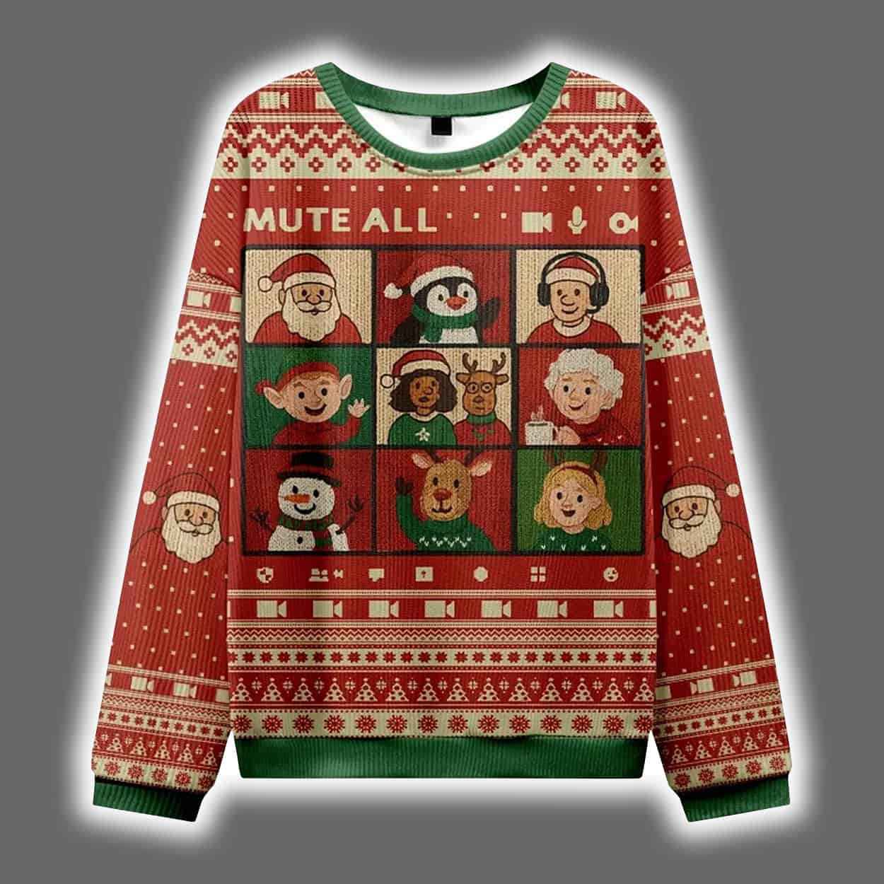 Get ready to sleigh the holiday fashion game with this sweater! Drenched in classic red and green with playful snowflakes, reindeer, and geometric patterns, this sweater is a festive feast for the eyes. But the real showstopper? A cheeky video call grid featuring twelve cartoon holiday icons—Santa, snowman, elf, and more—each caught mid-expression in a virtual meeting gone wild. Above them, the phrase “MUTE ALL” delivers the punchline, turning this cozy knit into a wearable meme for the Zoom-fatigued and holiday-hyped alike.