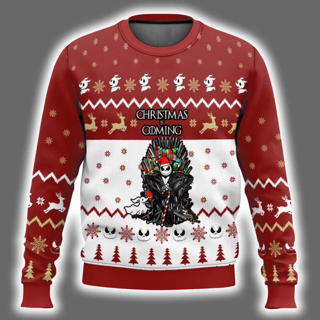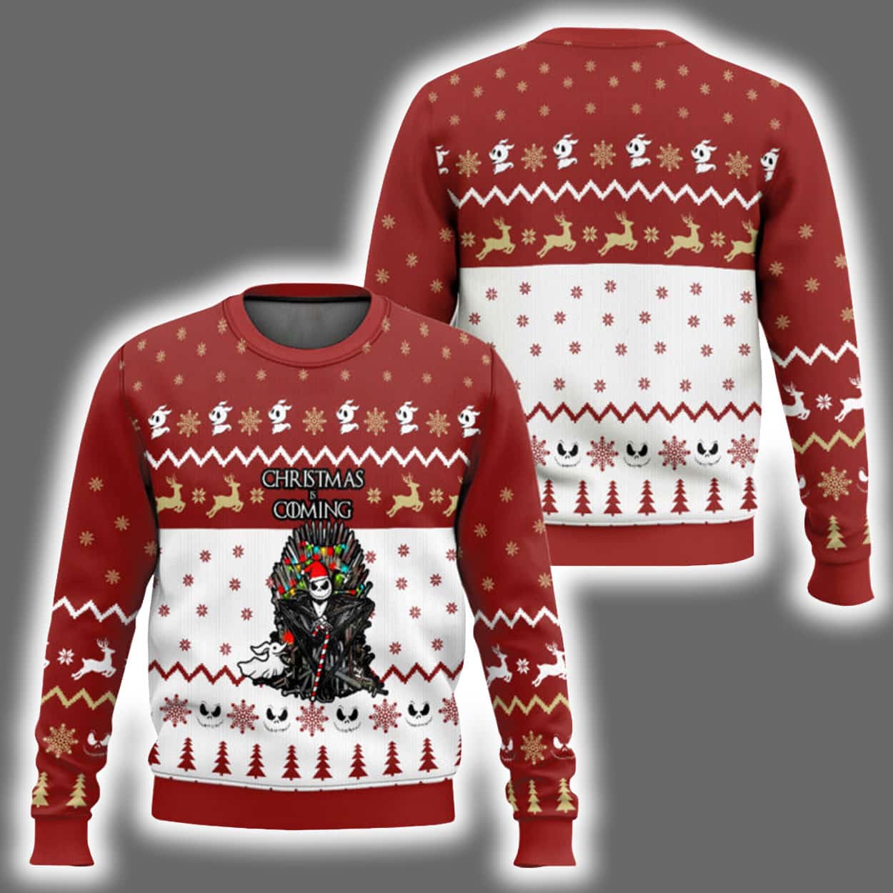 This isn’t your grandma’s Christmas sweater. With a bold red-and-white palette accented in gold, this eye-catching knit features classic holiday motifs—snowflakes, reindeer, and Christmas trees—woven into a chaotic celebration of the season. Front and center is a sinister, clown-like Jack Skellington-inspired character, grinning wickedly while clutching a candy cane like a scepter of mischief. Above him, the phrase “CHRISTMAS IS COMING” looms in stylized lettering, setting the tone for a holiday that’s anything but ordinary. The back continues the festive madness with matching patterns, ensuring you’re turning heads from every angle.