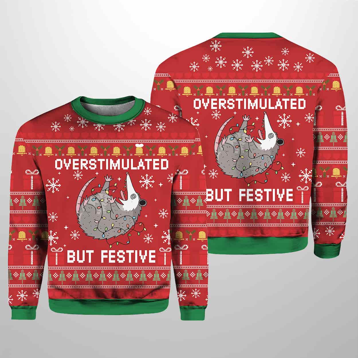 Finally, a Christmas sweater that truly understands you. This sweater is the perfect blend of holiday cheer and relatable exhaustion. Dominated by a vibrant red and green pattern, the design features traditional elements like snowflakes, jingle bells, and festive borders. The centerpiece, both on the front and the back, is a hilariously rendered possum—eyes wide and playing dead—completely tangled in a string of colorful Christmas lights. Below the creature, the bold text declares the wearer’s current emotional state: “OVERSTIMULATED BUT FESTIVE.”