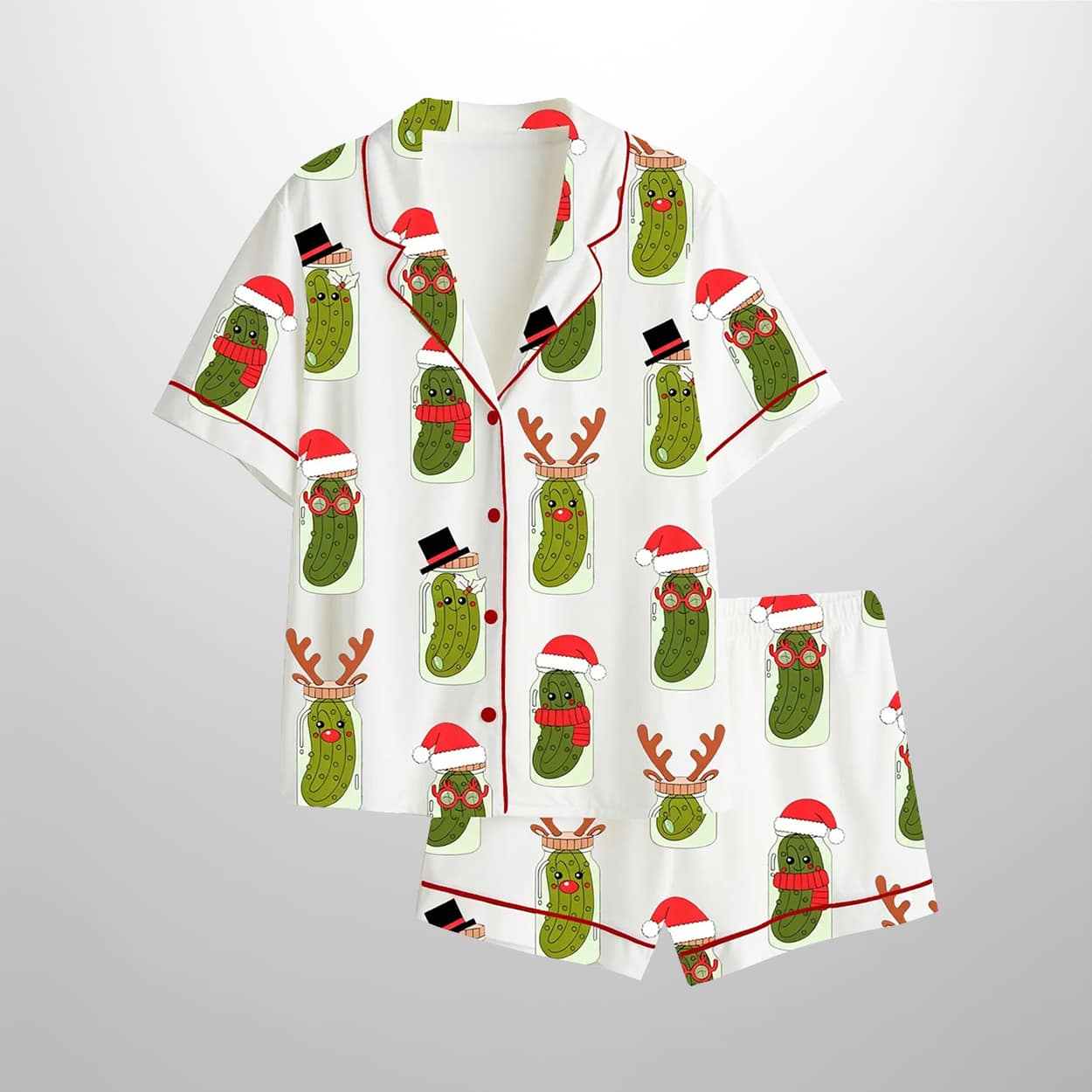 Make spirits bright and bedtime hilarious with this pajama set, a whimsical celebration of holiday joy and pickle pride. This short-sleeved button-up shirt and matching shorts are decked out in a repeating pattern of cartoon pickles dressed for the season—think Santa hats, reindeer antlers, top hats, and even monocles. Red piping along the collar, button line, and sleeves adds a classic holiday touch, while the playful pickles keep things lighthearted. It’s the perfect outfit for lounging, gifting, or hosting a quirky Christmas movie night.