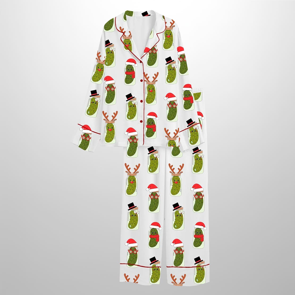 Get into a briny holiday spirit with the Christmas Pickles It’s The Most Delightful Time Of The Year Satin Pajama Set—where festive cheer meets quirky charm in a delightfully dill-icious design.