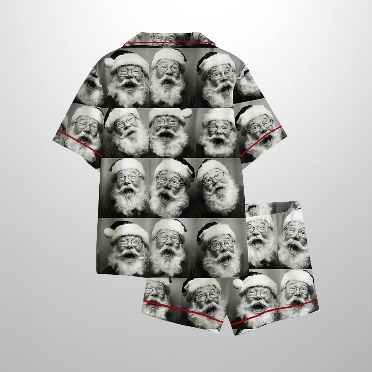 Celebrate the season with a pajama set that’s as jolly as the big guy himself. This set features a short-sleeve button-up shirt and matching shorts, both covered in a playful collage of black-and-white Santa Claus selfies. Each snapshot captures a different expression—from belly laughs to twinkling eyes—bringing a dose of holiday cheer to your sleepwear. Red piping along the collar, button line, sleeves, and short hems adds a festive pop, making this set a standout for cozy nights or Christmas morning photo ops.