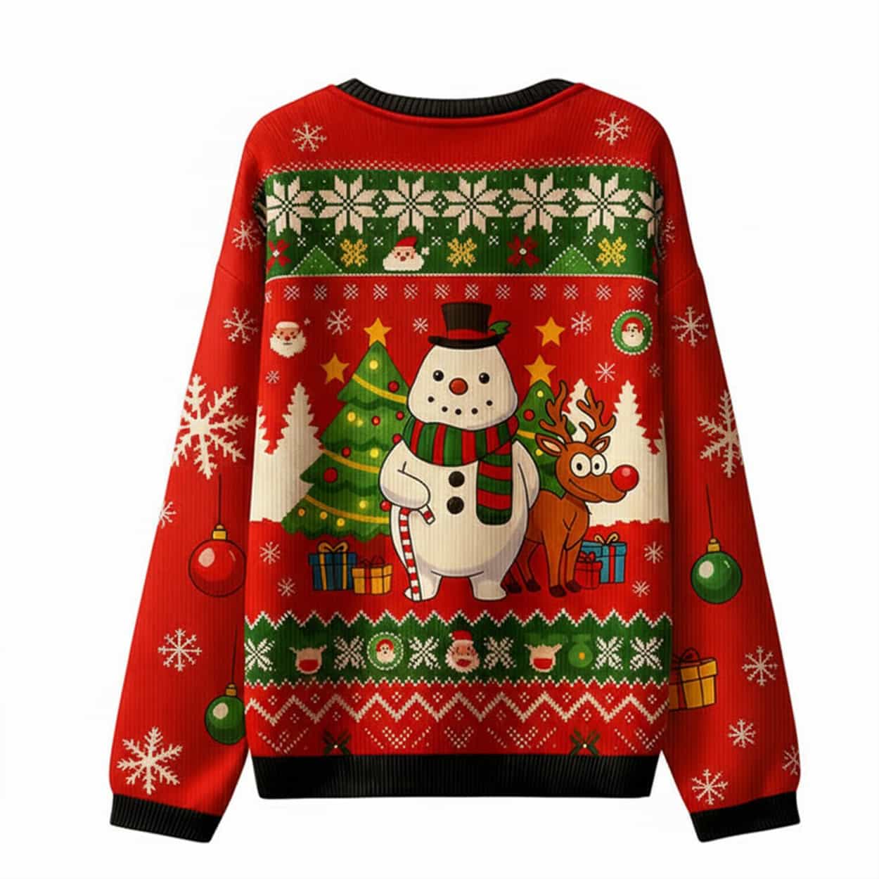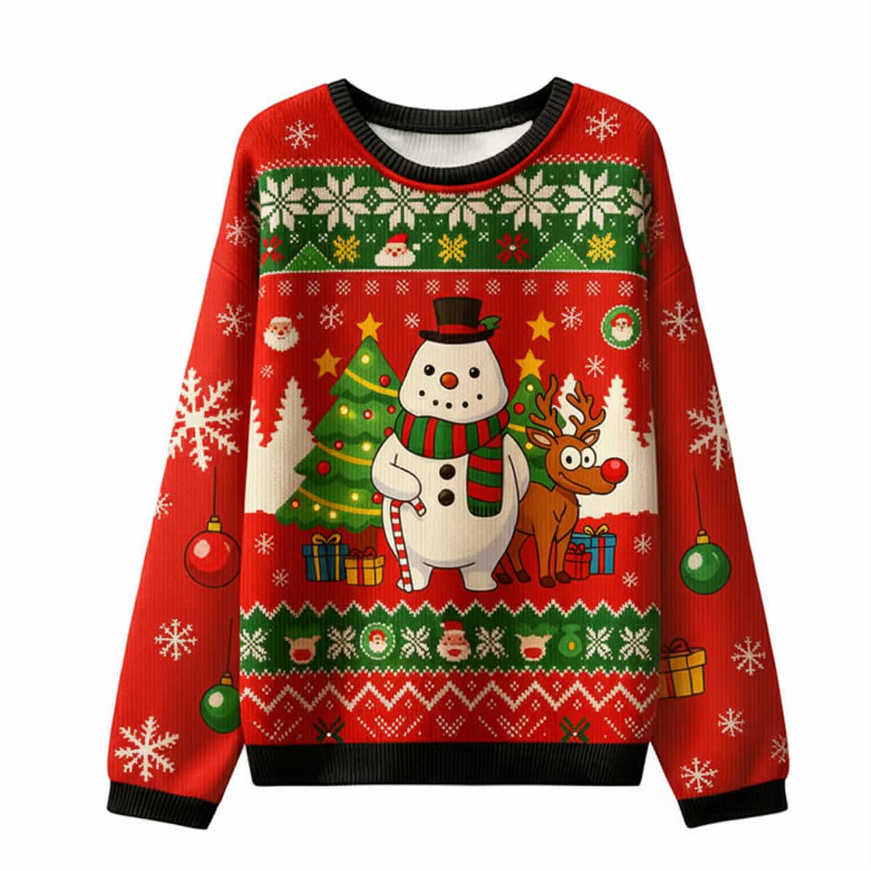 This pullover is the quintessential “Ugly Christmas Sweater,” featuring a vibrant red base with festive green and white Fair Isle knit patterns. The cheerful main graphic showcases a classic snowman in a top hat and scarf, standing next to a wide-eyed, red-nosed reindeer. They are surrounded by Christmas trees, presents, and falling snowflakes, while the sleeves are adorned with snowflakes and hanging ornaments.