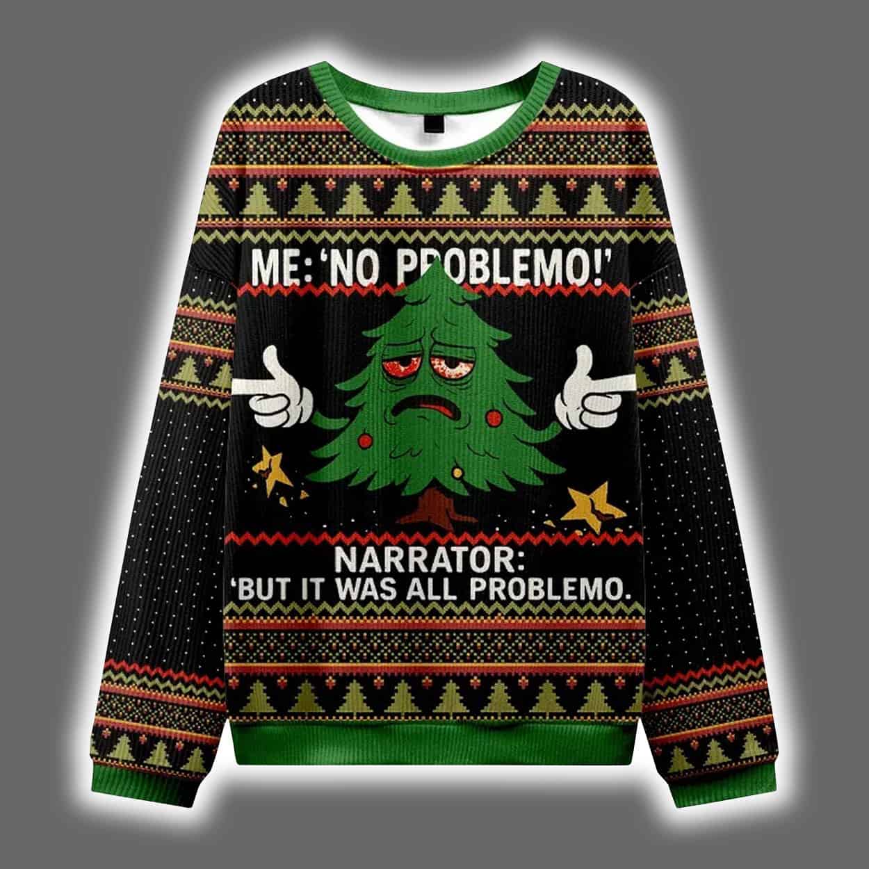 Say hello to your new holiday mood in sweater form. This eye-catching design features a cartoon Christmas tree with drooping branches, a fallen star, and a hilariously frazzled expression. Despite its clear distress, the tree throws up two enthusiastic thumbs—because hey, it’s trying! Above the tree, bold text reads: “ME: ‘NO PROBLEMO!’” and below, the punchline lands: “NARRATOR: ‘BUT IT WAS ALL PROBLEMO.’” The background bursts with traditional red, green, and black holiday patterns, adding a festive flair to the comedic meltdown. From front to back, this sweater is a walking punchline wrapped in seasonal charm.