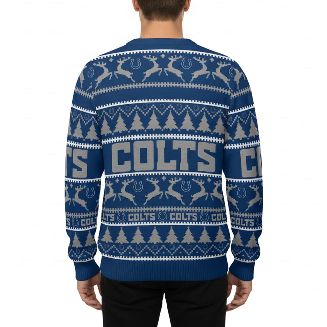 Get ready to blitz the holiday party circuit with this sweater! This festive blue sweater bursts with seasonal spirit and team pride. Front and center is a cartoon Santa Claus, decked out in classic red and white with a Colts logo on his chest, clutching a football trophy like it’s the ultimate gift. His glasses add a touch of swagger, while the background dances with reindeer, snowflakes, and trees. The word “COLTS” repeats across the chest and sleeves, making it clear where your loyalty lies. It’s a bold, hilarious, and heartwarming tribute to fans who dream big.