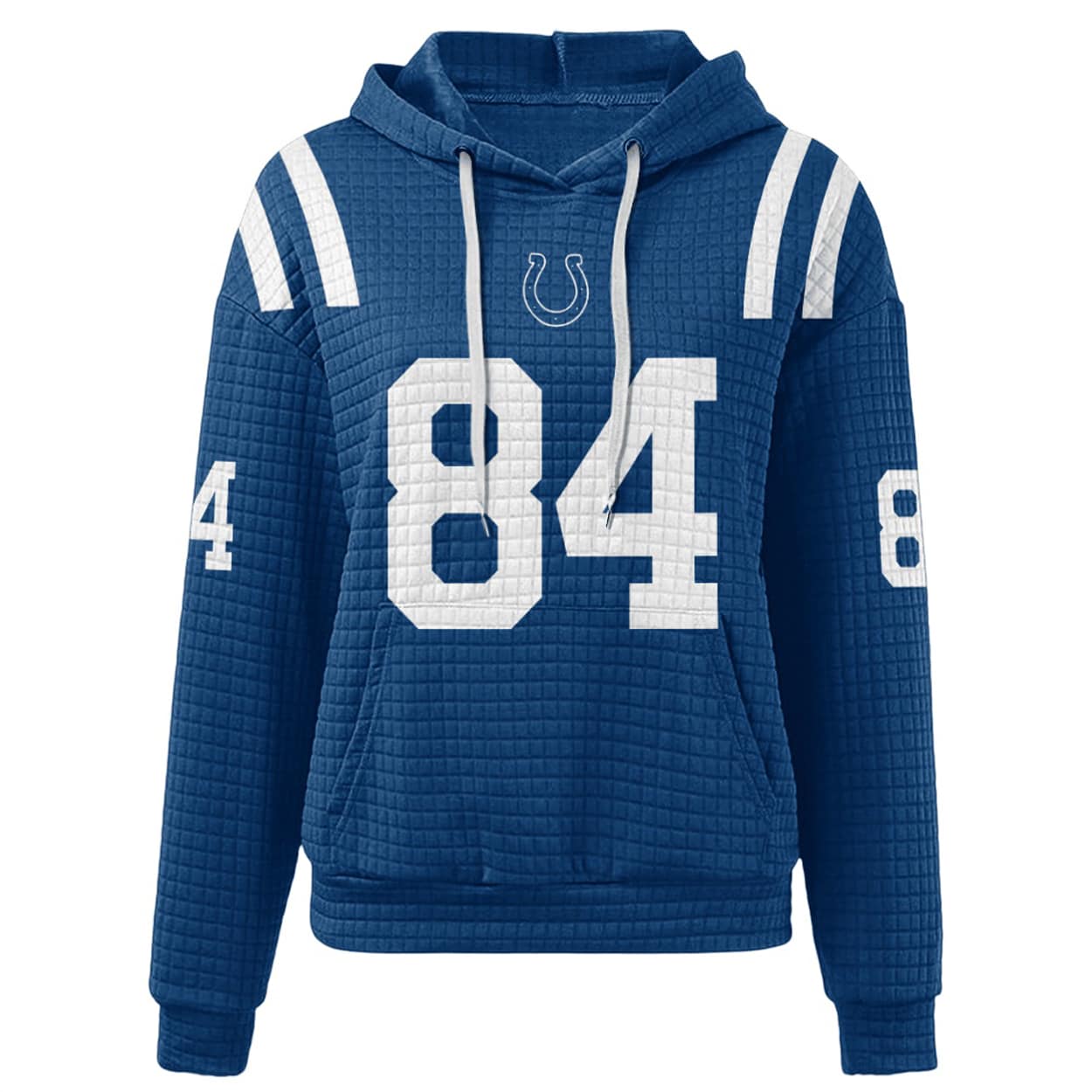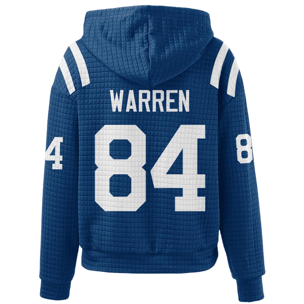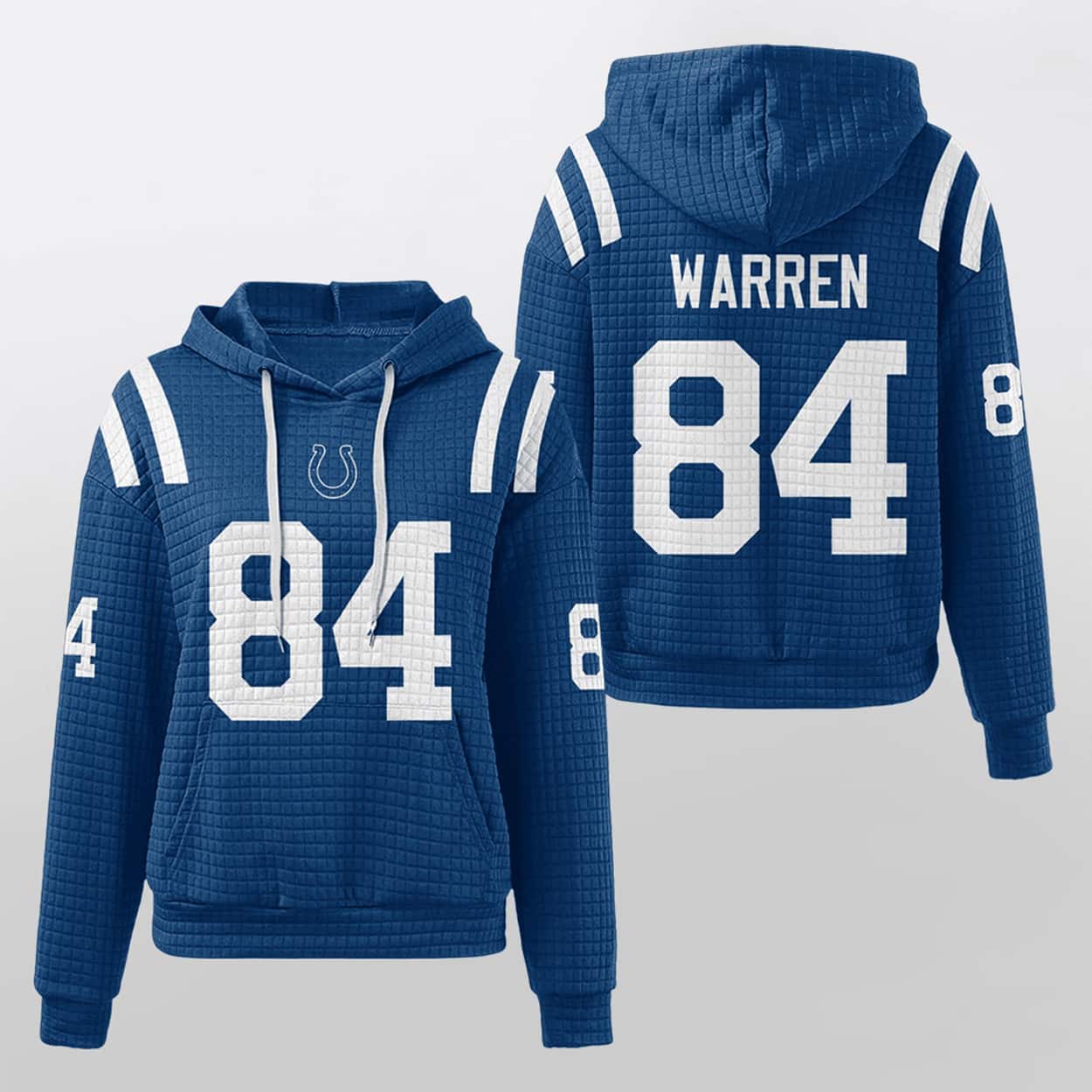 Turn heads and rep your team with this hoodie—a fan favorite that blends sporty flair with undeniable personality. This hoodie features a textured waffle pattern and crisp white accents that pop from every angle. The front proudly displays the number “84” in bold block print, flanked by the iconic Colts horseshoe logo above it. Matching “84” prints on both sleeves add symmetry and swagger, while the back seals the deal with “WARREN” in all caps above another oversized “84.” White shoulder stripes complete the look, giving it that classic gridiron edge.