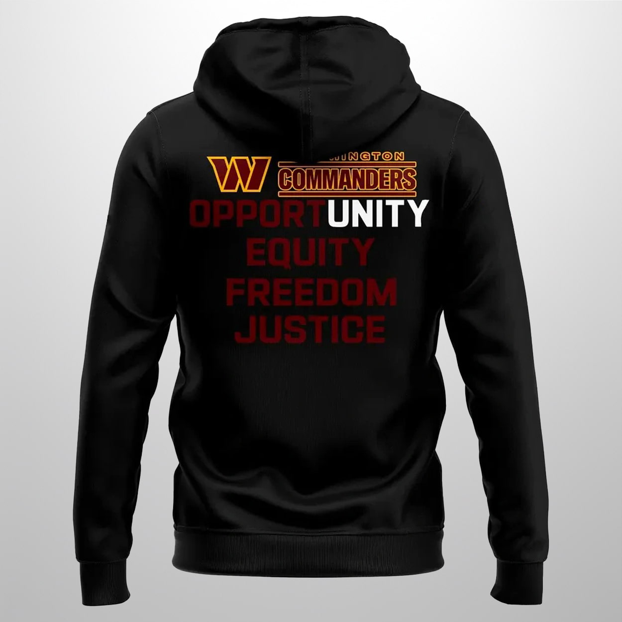 This hoodie isn’t just fan gear. On the front, the Washington Commanders logo sits proudly above the rallying cry “INSPIRE CHANGE” in bold red, followed by a lineup of values in crisp white: “OPPORTUNITY • EQUITY • FREEDOM • JUSTICE.” Flip it around and the back turns up the volume with a red box shouting “COMMANDERS,” and a vertical stack of powerful words—“OPPORTUNITY,” “UNITY,” “EQUITY,” “FREEDOM,” “JUSTICE”—each one a call to action. This hoodie doesn’t whisper—it speaks volumes.