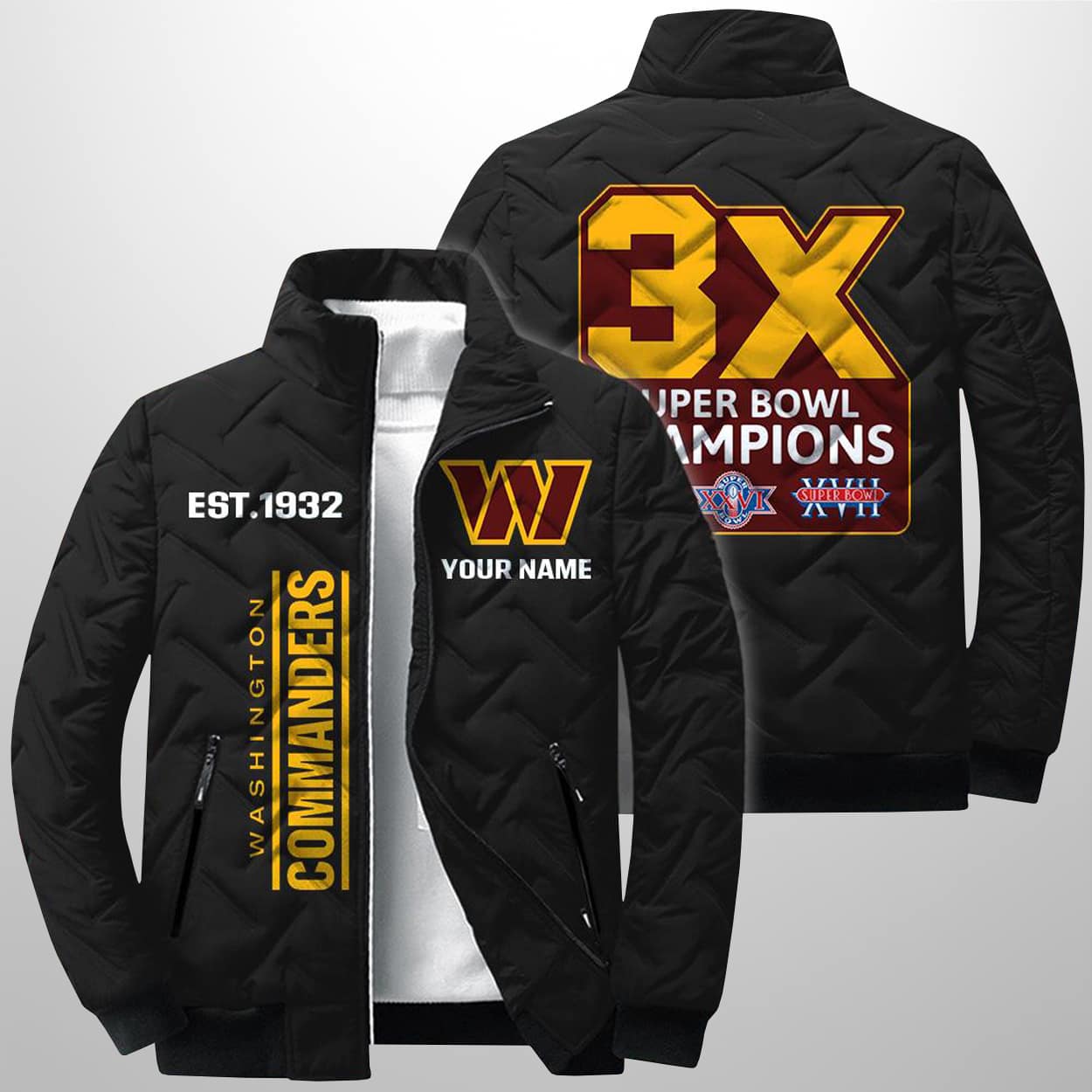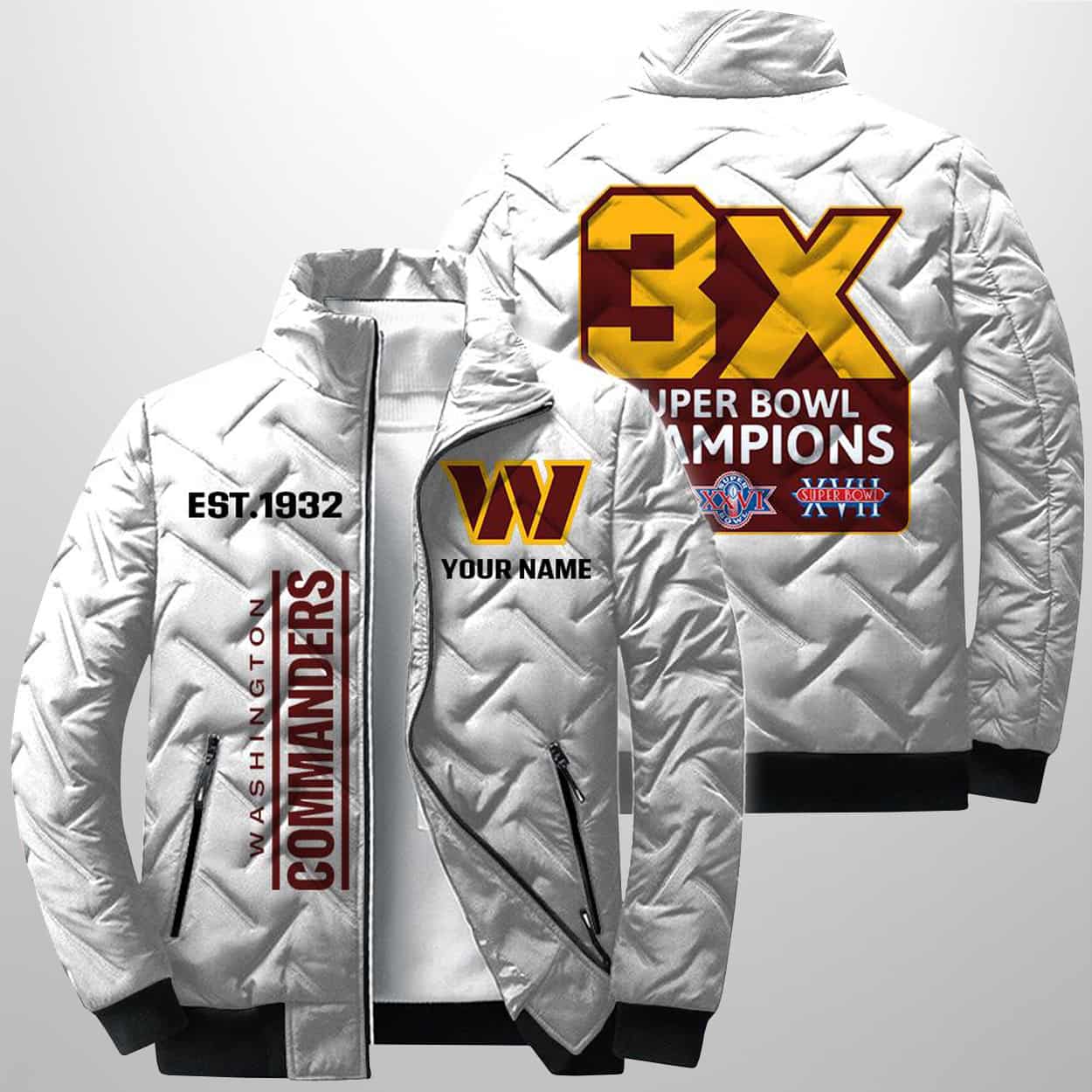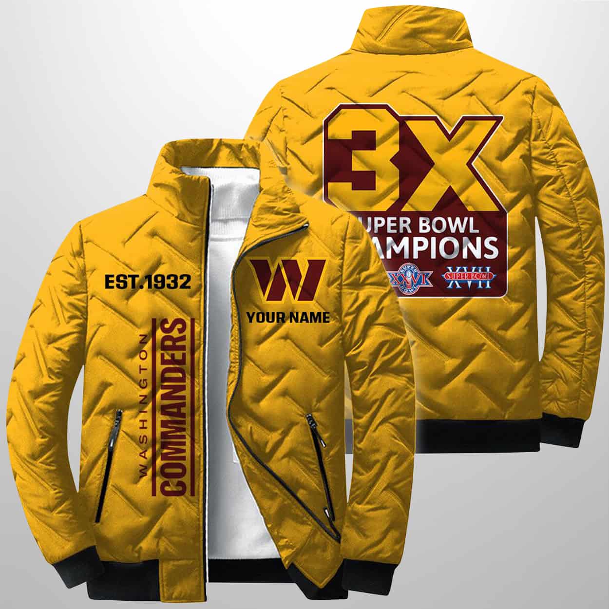 Celebrate championship legacy and stay cozy in the Commanders Est 1932 3X Champions Winter Warm Quilted Jacket—bold, customizable, and built for fans who lead with pride.