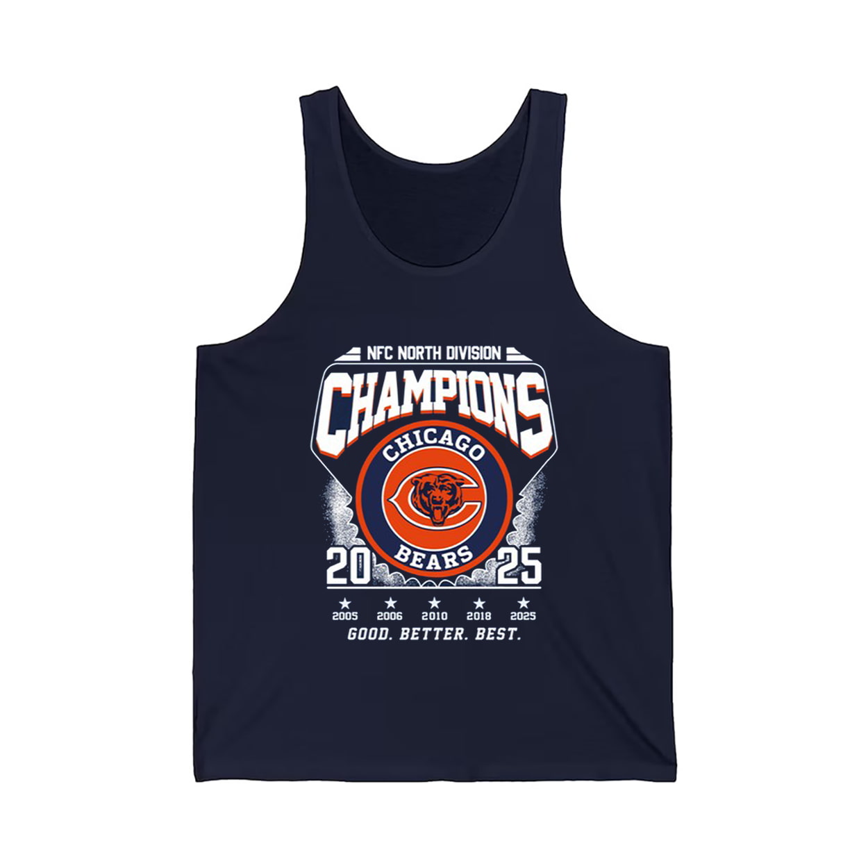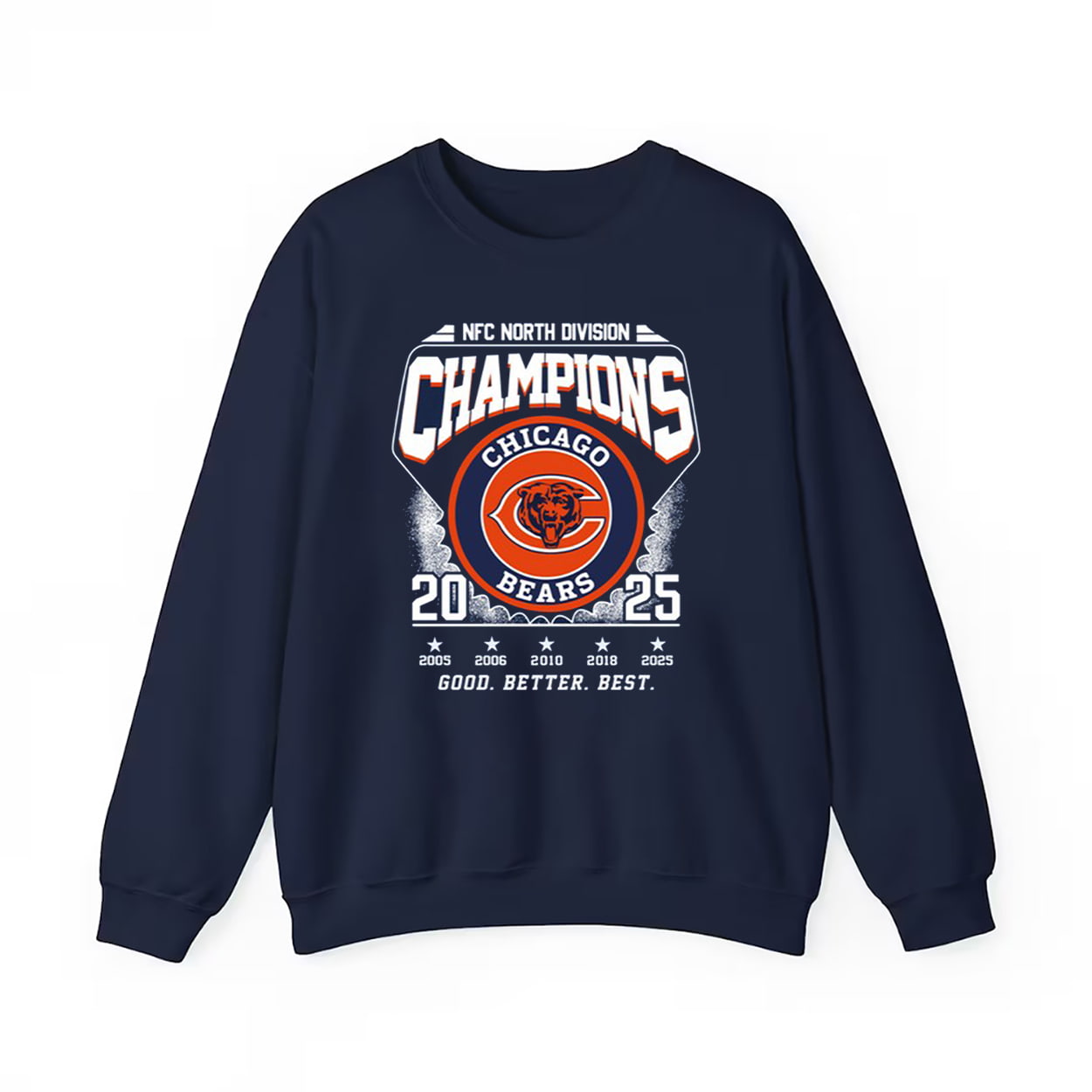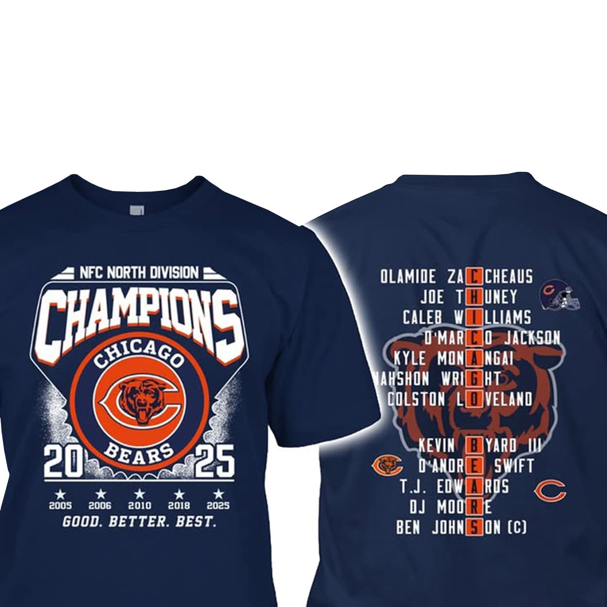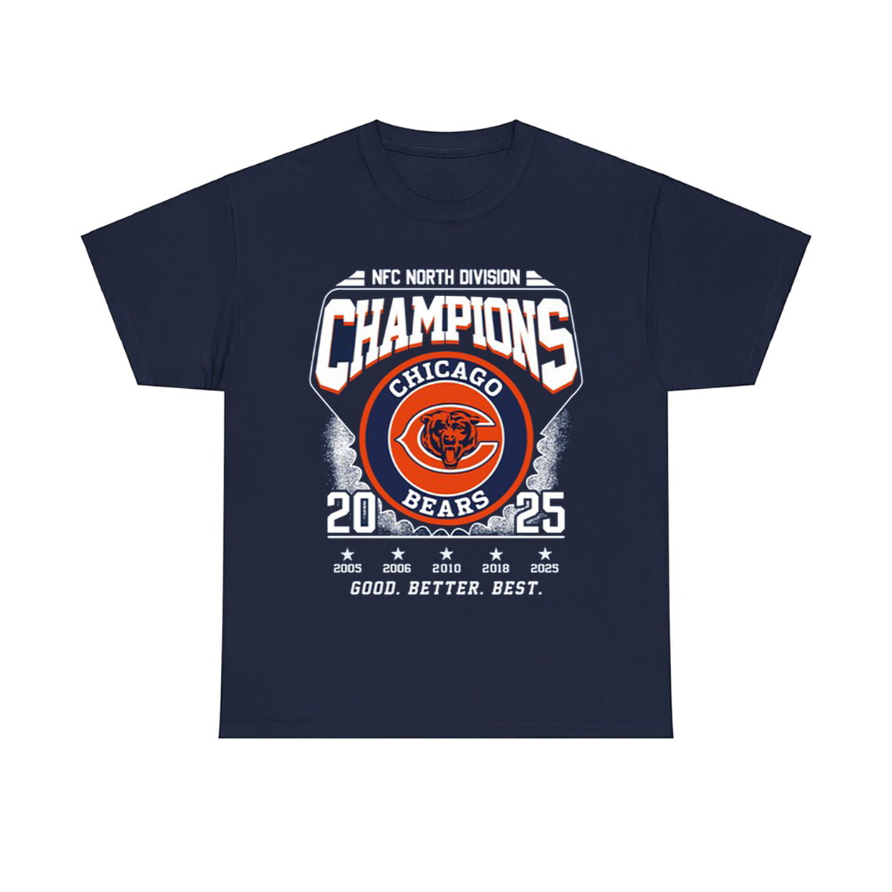 Step into the winner’s circle with this shirt—a wearable tribute to a season of grit, glory, and gridiron greatness. The front proudly declares “NFC NORTH DIVISION CHAMPIONS” alongside the iconic Chicago Bears logo and the victorious year “2025,” flanked by past championship years like 2001, 2005, and 2018. Beneath it all, the slogan “GOOD. BETTER. BEST.” reminds fans that this team didn’t just play—they dominated.