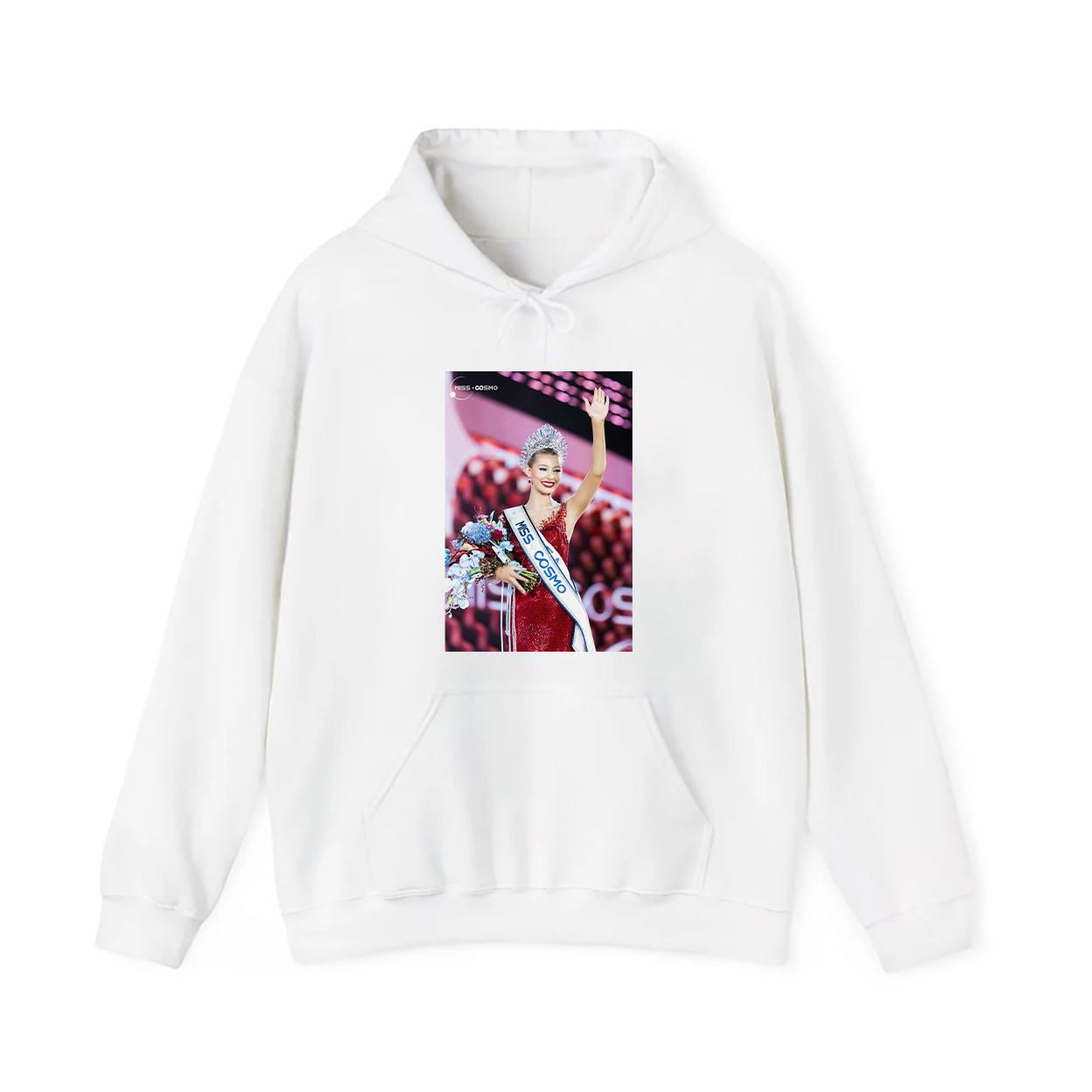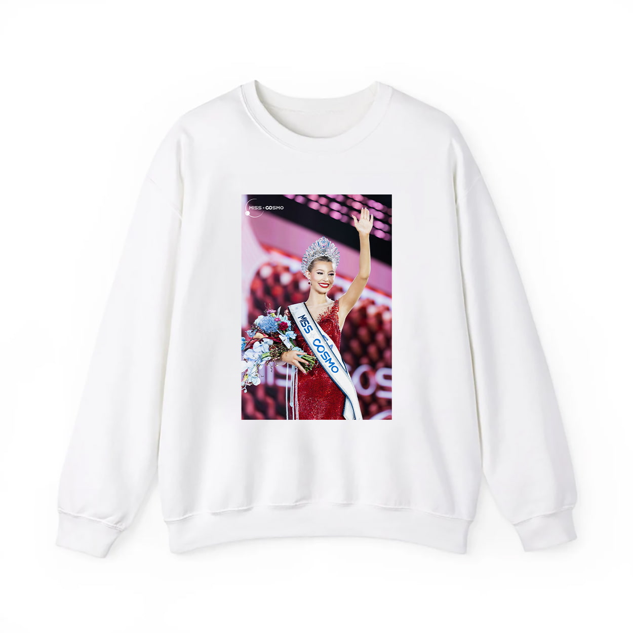 Step into the spotlight with this shirt—a wearable celebration of triumph, sparkle, and unapologetic confidence. The front features a vibrant photo of Yolina Lindquist in her winning moment: dazzling in a red sequined gown, crowned with glory, bouquet in hand, and waving with radiant joy. The backdrop glows with stage lights and the iconic “MISS COSMO” banner, making this shirt a snapshot of pure pageant magic.