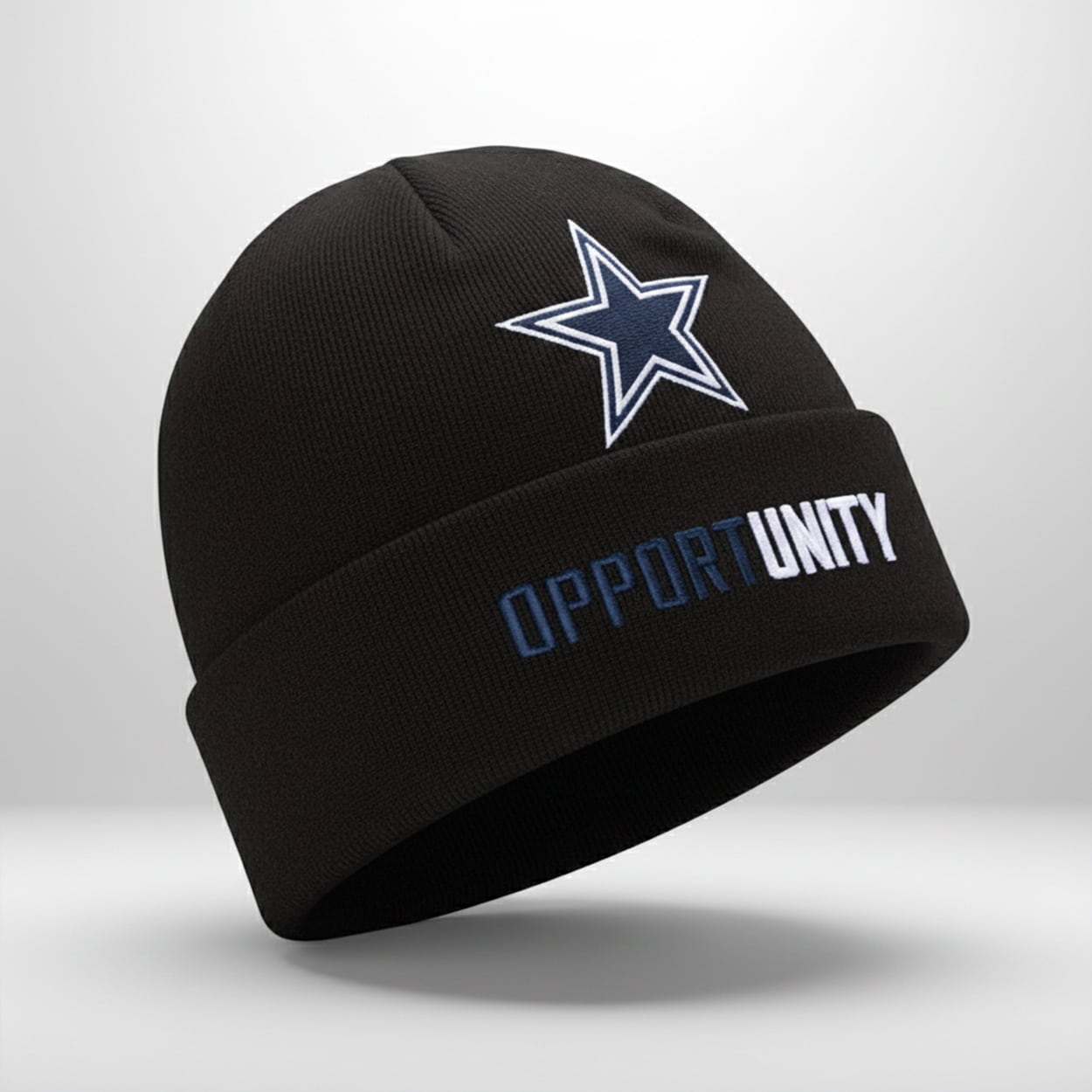 Step into the season with swagger and substance in this hat. This beanie features a folded brim that proudly showcases the iconic Dallas Cowboys star—embroidered in crisp blue and white, front and center. But it’s the word beneath that steals the show: “OPPORTUNITY,” split playfully into “OPPORT” in blue and “UNITY” in white. It’s not just a hat—it’s a conversation starter, a head-turner, and a nod to the power of coming together.