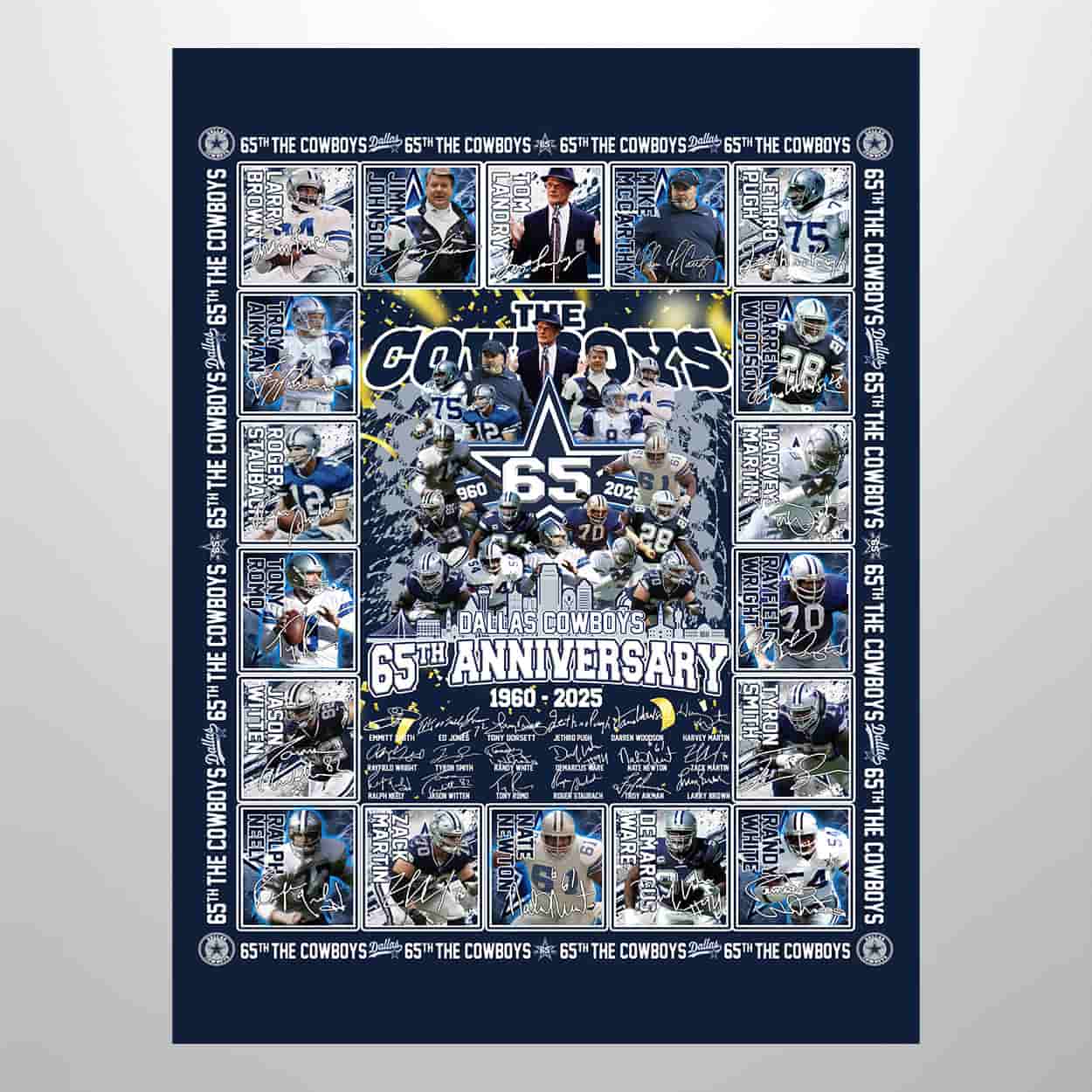 Wrap yourself in football history with this blanket, a bold tribute to the team’s journey from 1960 to 2025. The design bursts with energy, featuring a central emblem that proudly reads “THE COWBOYS 65TH ANNIVERSARY 1960 – 2025,” flanked by action-packed visuals of iconic players across generations. From helmet-clad heroes mid-play to framed portraits of legends in their prime, every inch of this blanket is a celebration of Cowboys excellence. The border repeats “65TH THE COWBOYS” in a stylized font, adding rhythm and flair to the visual story.