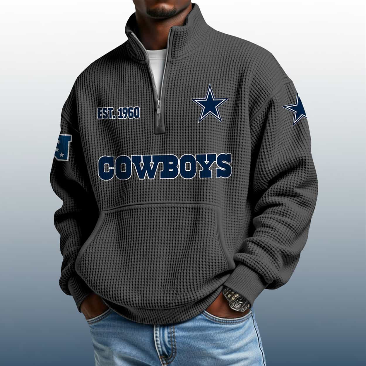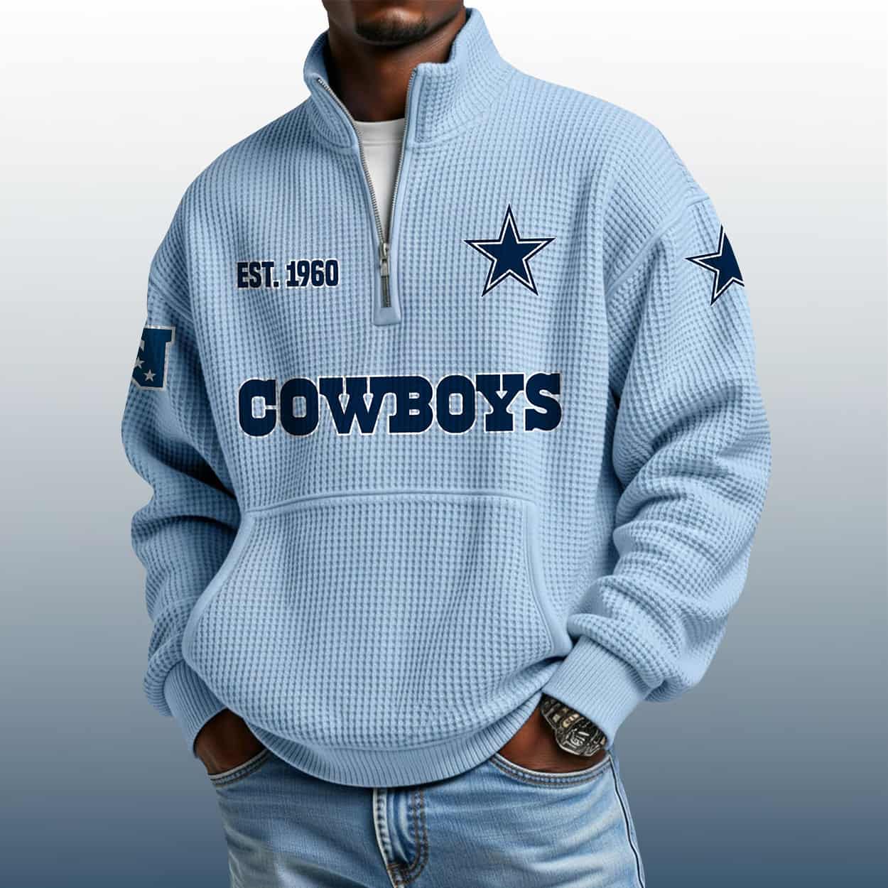 Bold Moves & Blue Threads: The Cowboys Est 1960 Stand Collar Half Zip Waffle Sweatshirt That Speaks Volumes
