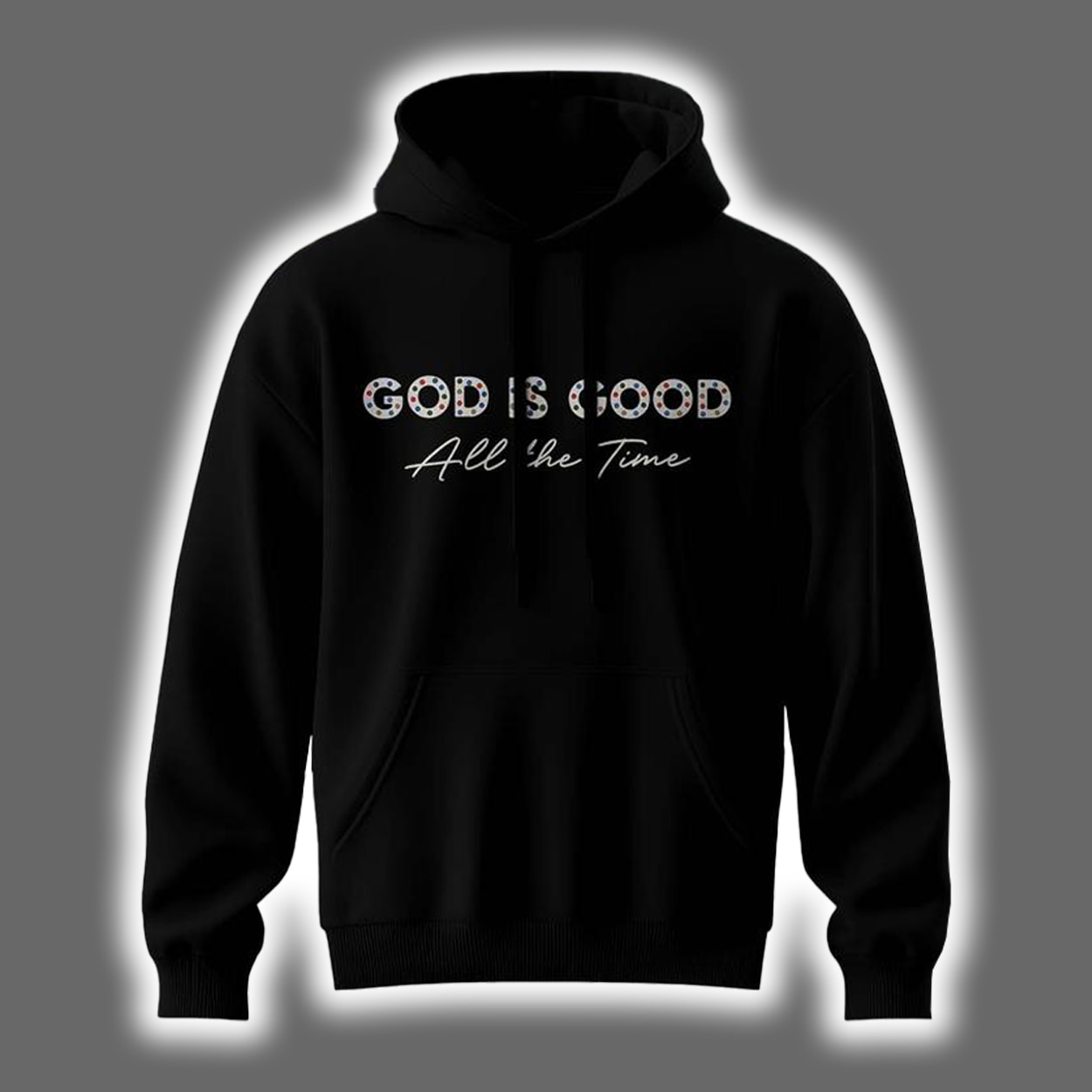 This hoodie isn’t just warm—it’s a whole vibe. On the front, “GOD IS GOOD” shines in bold, glittery letters, catching light and attention alike. Just beneath, the phrase “All the Time” flows in elegant cursive, adding a soft touch to the powerful message. Flip it around and you’ll find a dazzling tribute to America’s Team: the word “DALLAS” runs vertically along the left, framing a large Cowboys star logo that sparkles with pride. Below it, “Cowboys” is written in graceful script, tying together faith and fandom in one unforgettable look.